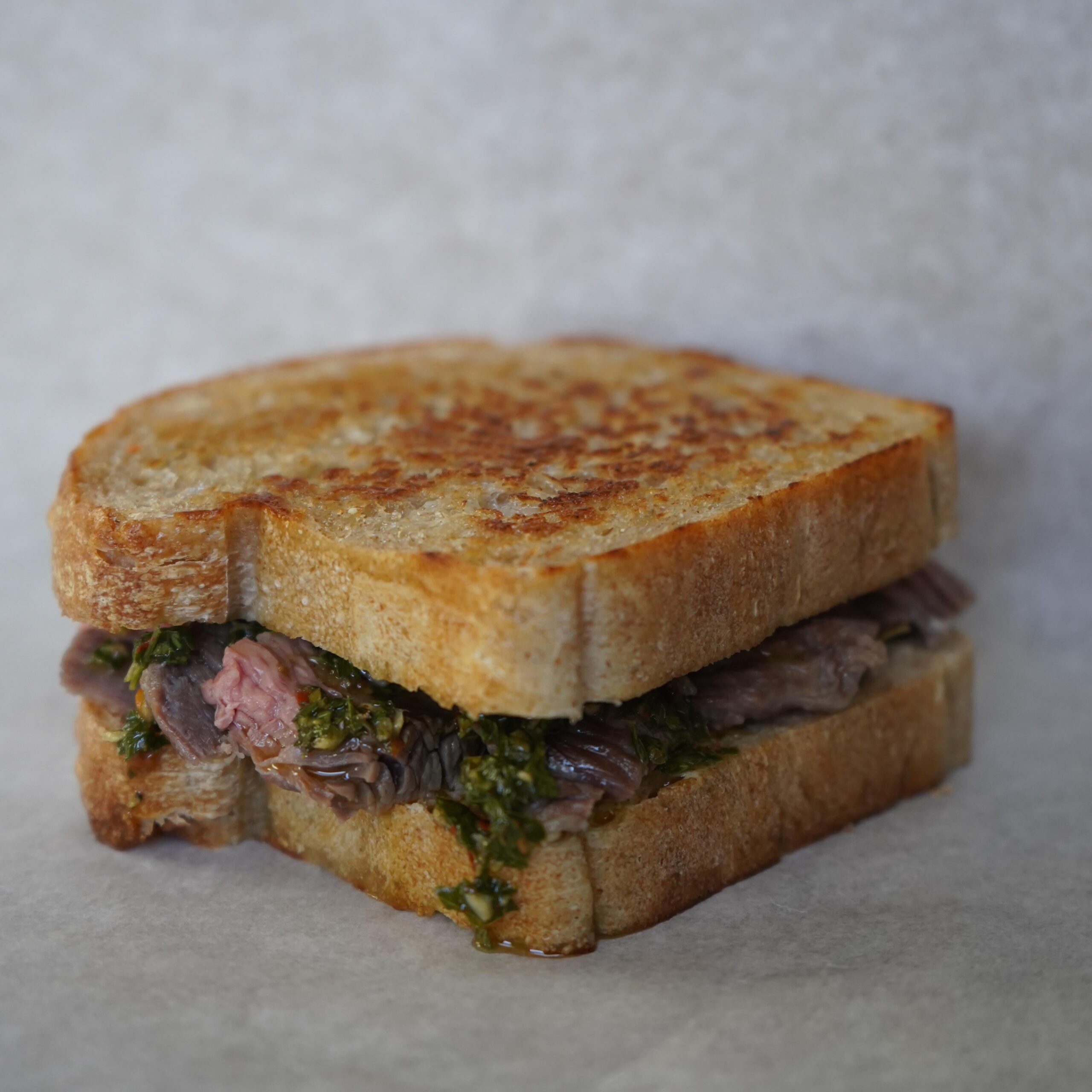 Simple steak, chimichurri, and roasted garlic mayo on homemade sourdough.