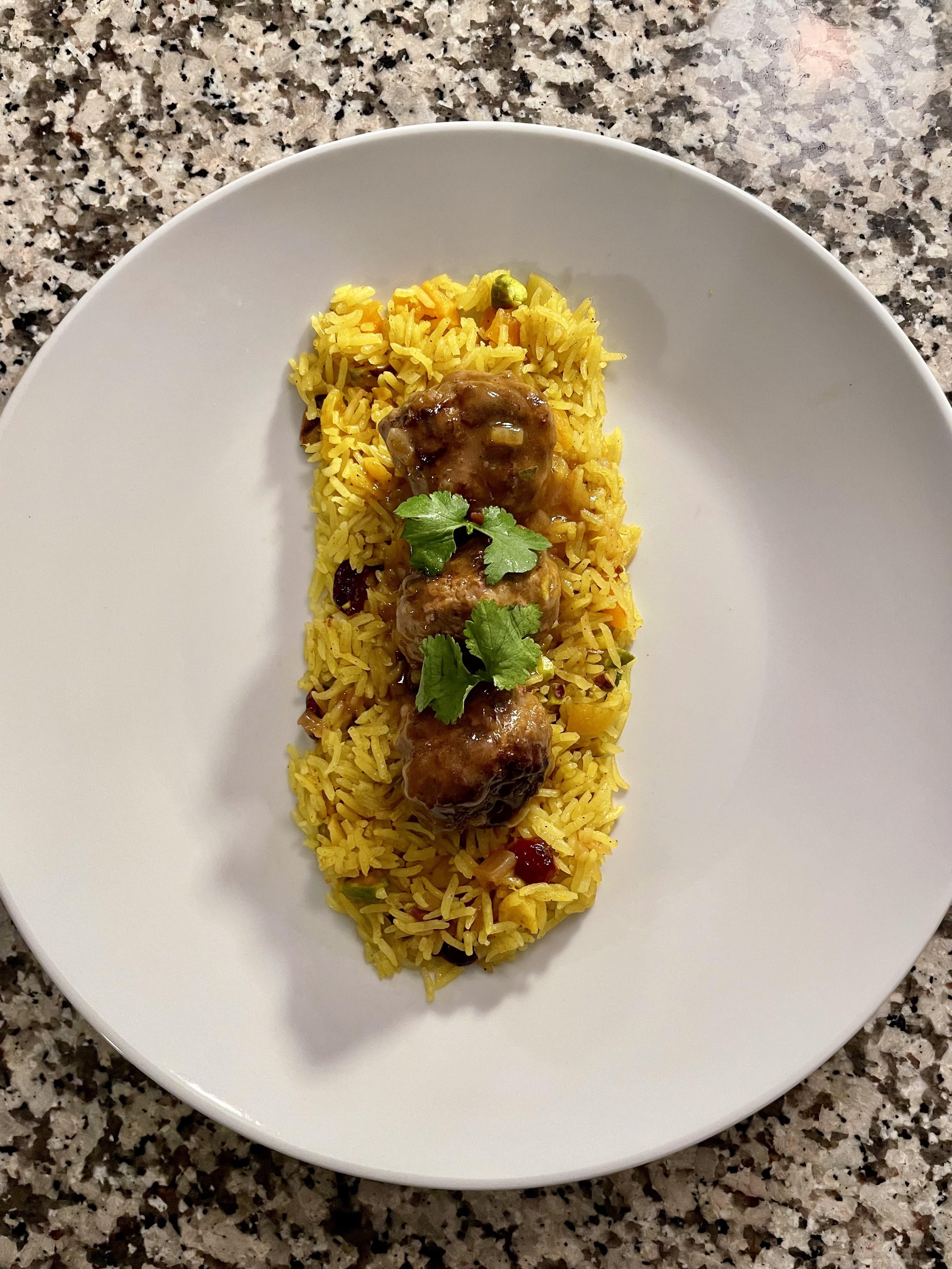 Persian lamb meatball, gravy, jeweled rice, parsley