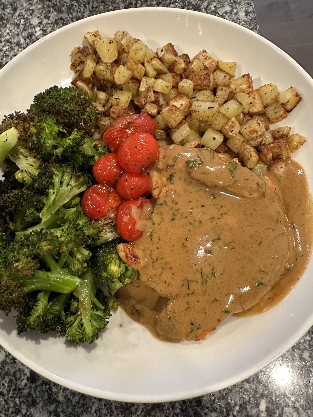 This is what I wish the portion sizes looked like. I added extra broccoli, potatoes, tomatoes and extra sauce.