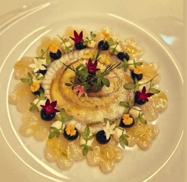 Amuse: Smoked wild eel, scallops, sojagel, yuzucream, olive oil, fresh and handpicked herbs and flowers