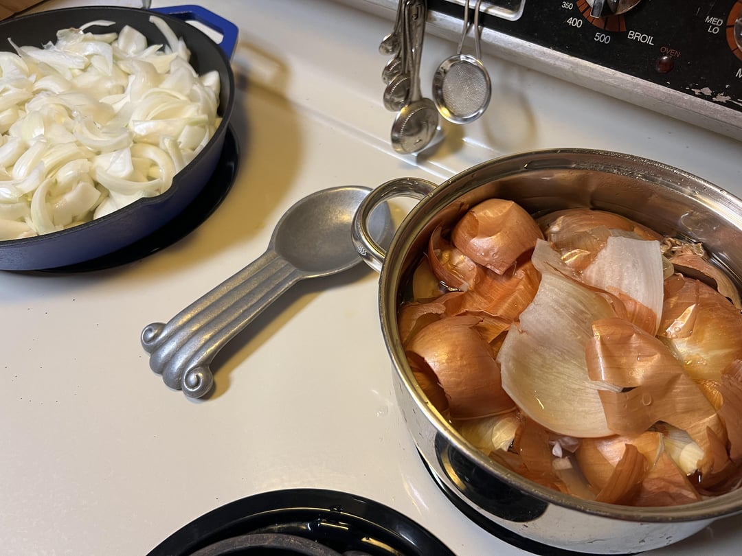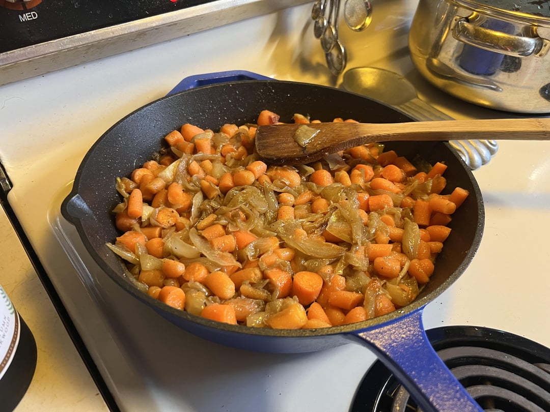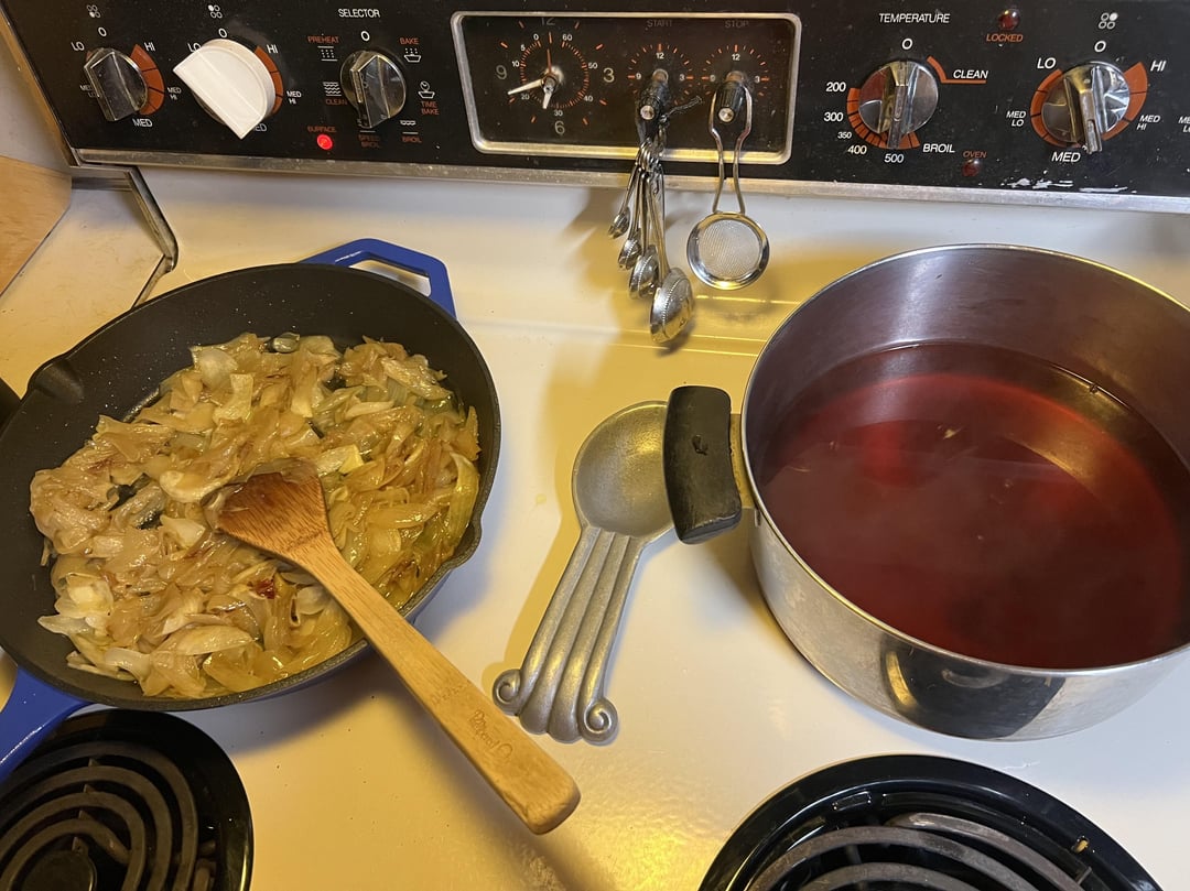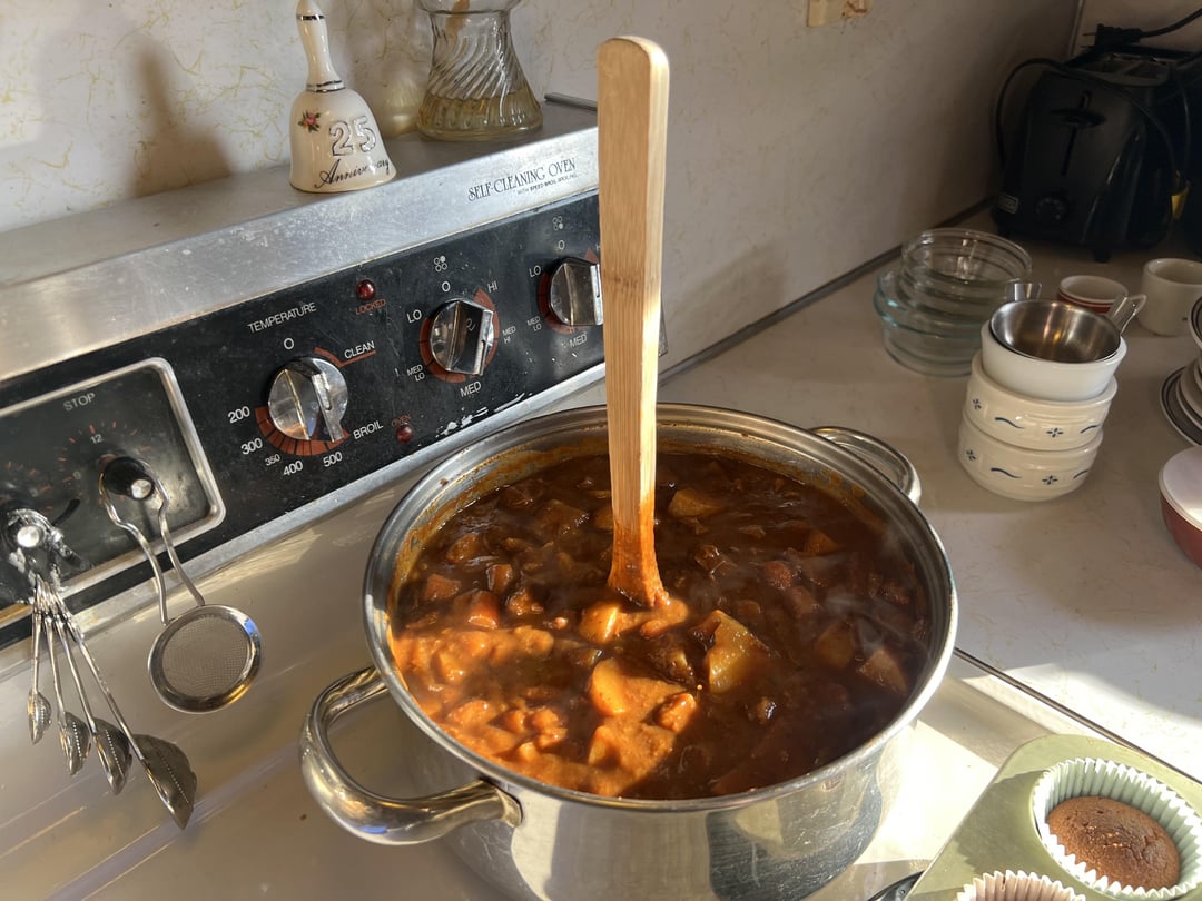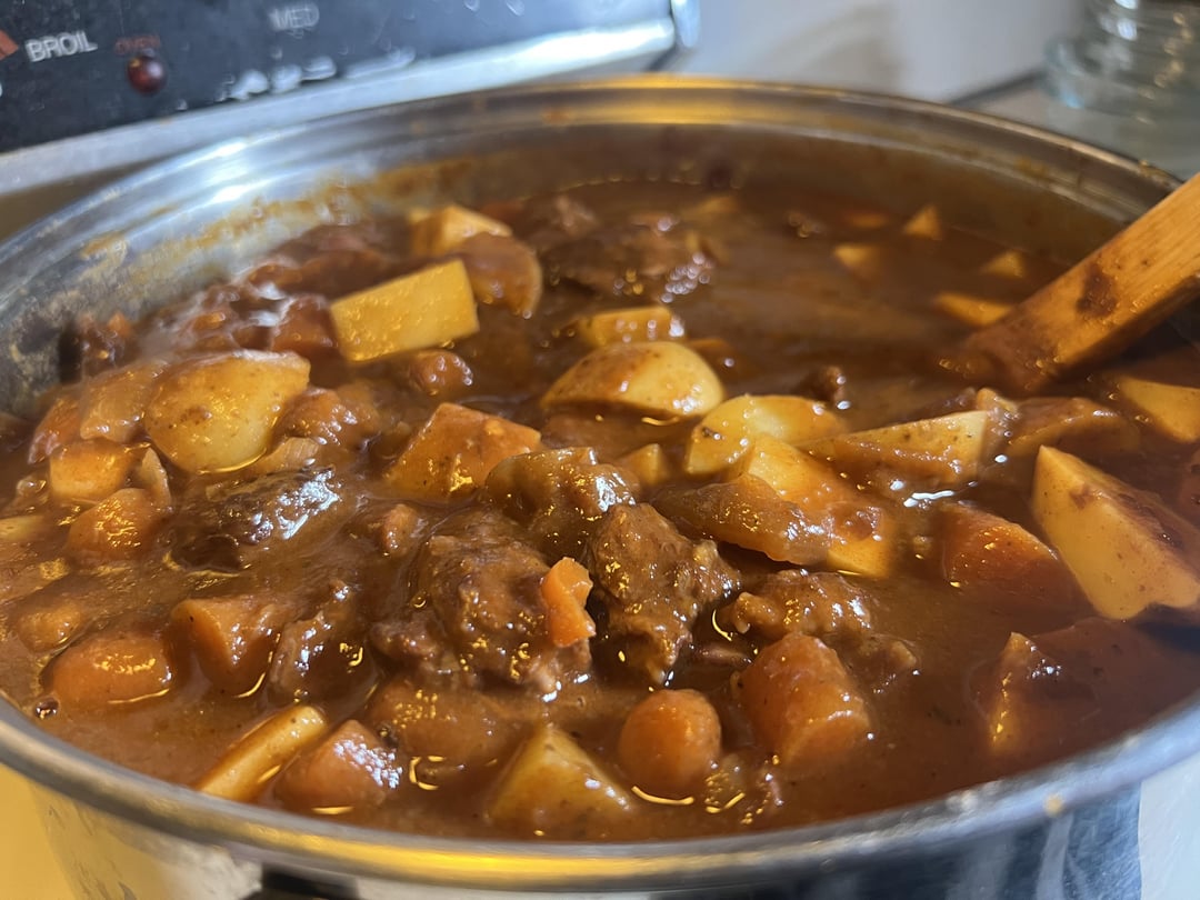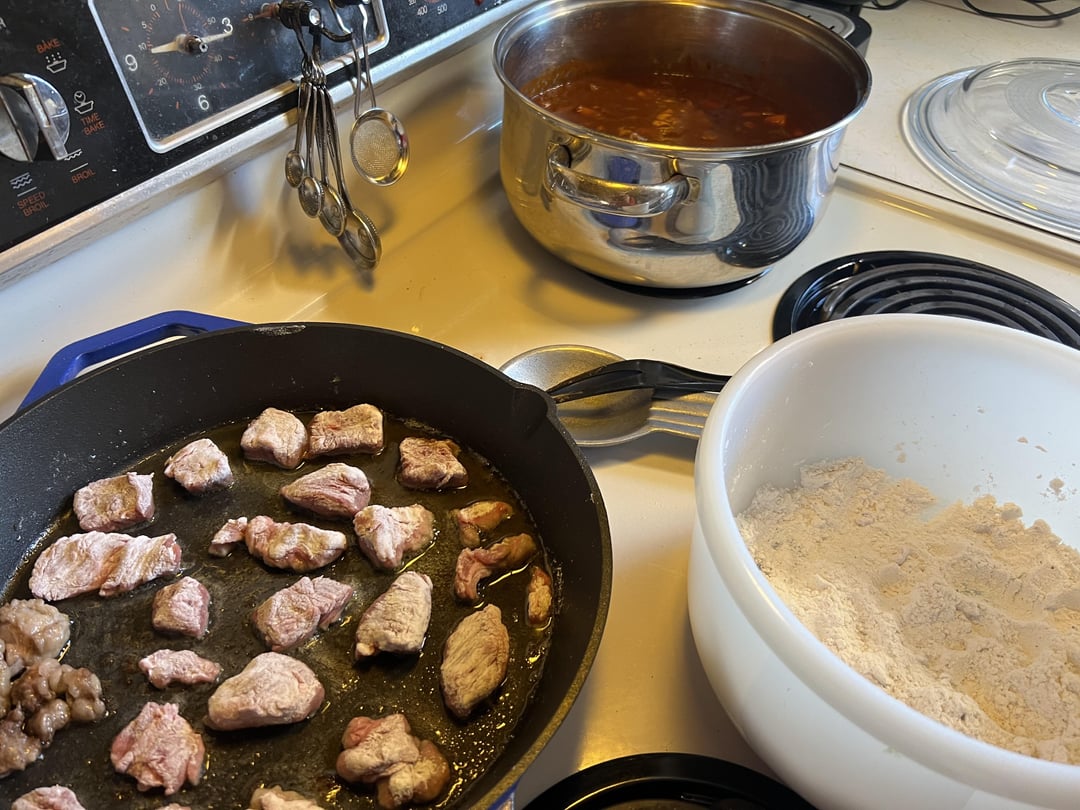 This is Hungarian goulash. Chuck roast, potato, carrot and (a lot) paprika are the main ingredients. I add (a lot) of onions and some tomato paste. Worcestershire, salt pepper etc. Yesterday I started cutting 3 lbs of onions at 3 am and it was worth the effort. They take hours to get that Maillard reaction going right. Same with the carrots. Finally when you add it together, low and slow all day and the beef falls apart in your mouth. The spoon should stand up and member to stir!