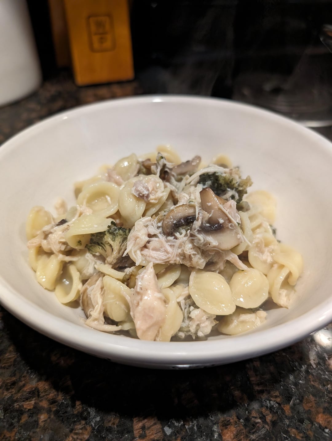 I threw it in with some cooked mushrooms and some dehydrated/rehydrated broccoli (not the best choice, honestly ..bit chewy) and some pasta and holy cow I like it.