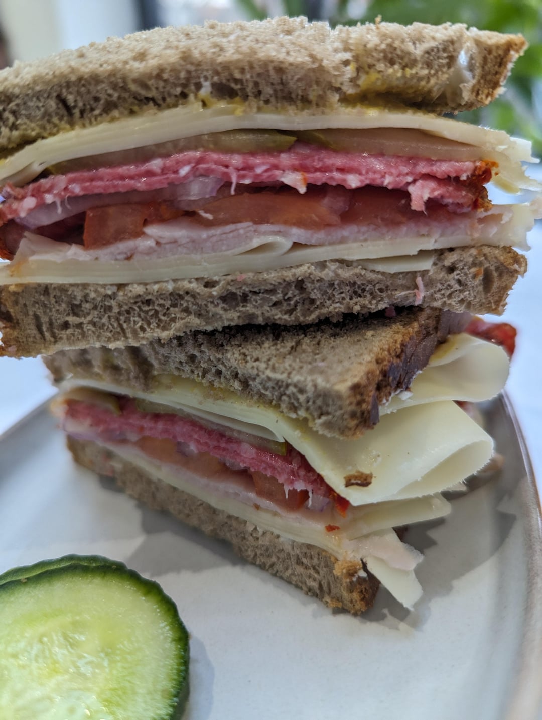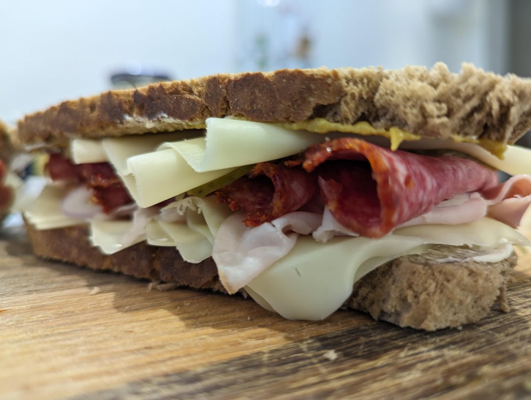 Gouda, ham and pepper crusted salami with pickles and beer mustard. Extra black pepper added.by ABarInFarBombay Write A CommentYou must be logged in to post a comment.
