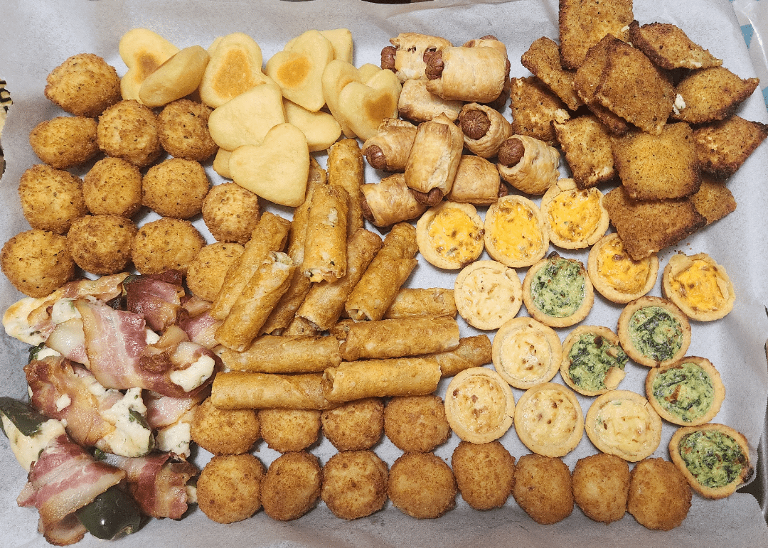 Almost everything is from Aldi. Left to right – Buffalo chicken mac and cheese balls, bacon wrapped jalapeno poppers, potato puffs, Southwest chicken taquitos, bacon Mac and cheese bites, pigs in a blanket, assorted quiche, and baked ravioli
