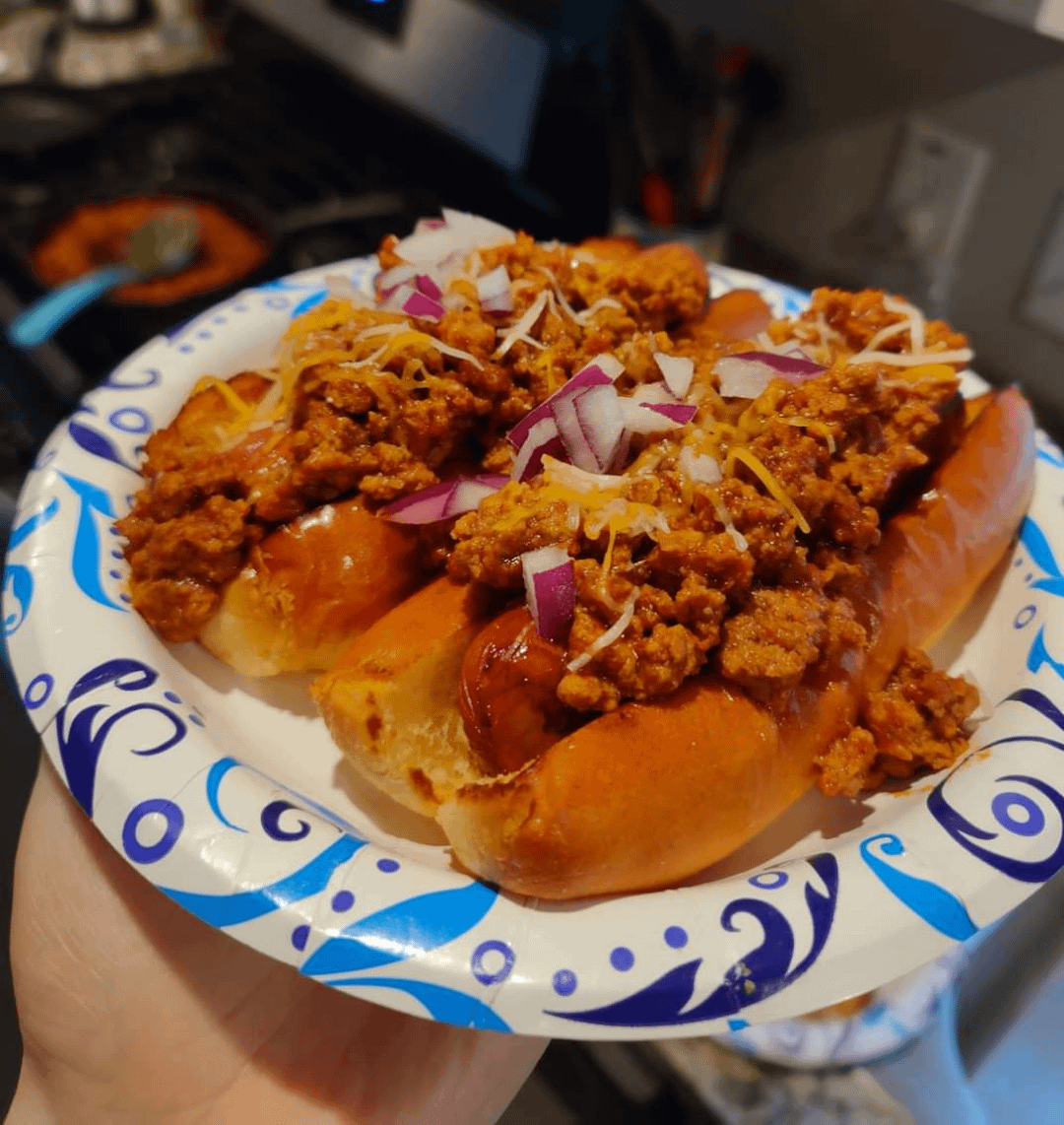 My personal preference on a chili cheese dog us liquid, but this is truly the best way to eat a dog or a brat. Looks great!