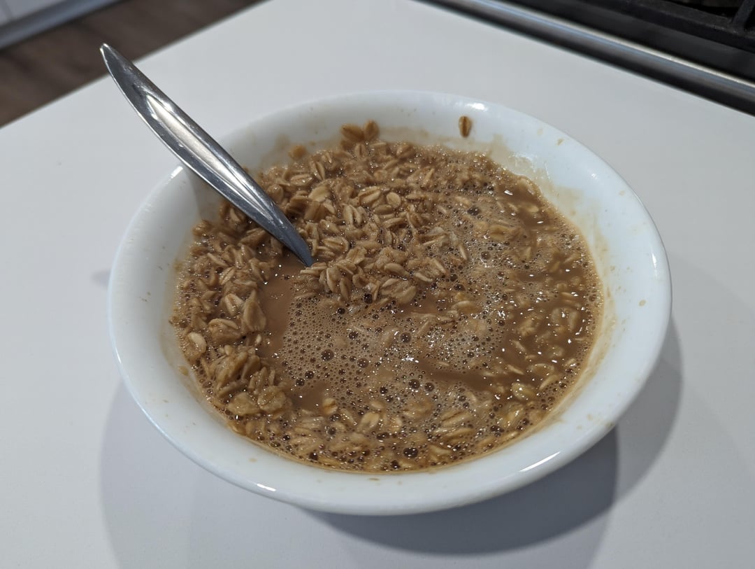 I’ll take a bowl of rolled oats, microwave them for 2 minutes with some plant based milk to soften them up. And then add about 2 or 4 oz of coffee to the bowl. From then I might add maple syrup or something to sweeten it a bit, maybe cinnamon.
