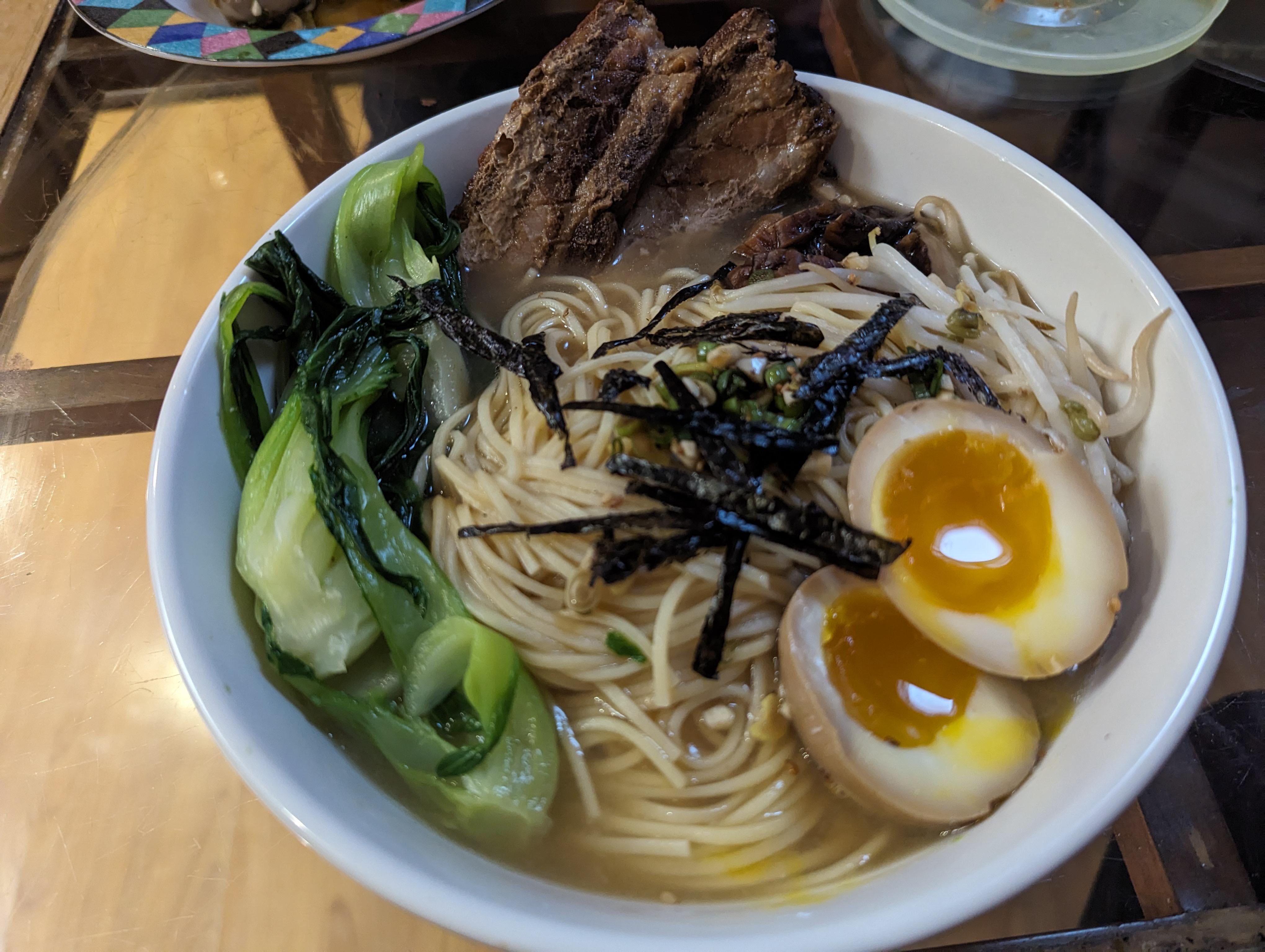 Hello. Ramen chef here. Your egg is nicely done. When you plate your noodles fold them over once evenly in a square and put your chashu on top. As far as nori cut it in rectangles and place like u currently have your chashu. I also suggest searing the bok choy for extra texture. Idk if you added a finishing oil or tare but the Taré helps the salinity and if you use sesame oil or burnt garlic oil, yhe bitterness counters the sweetness and makes it both full bodied and adds a nice flavor. Or scallion oil. Also adding chicken carcasses adds a nice texture when u want that white creamy flavor