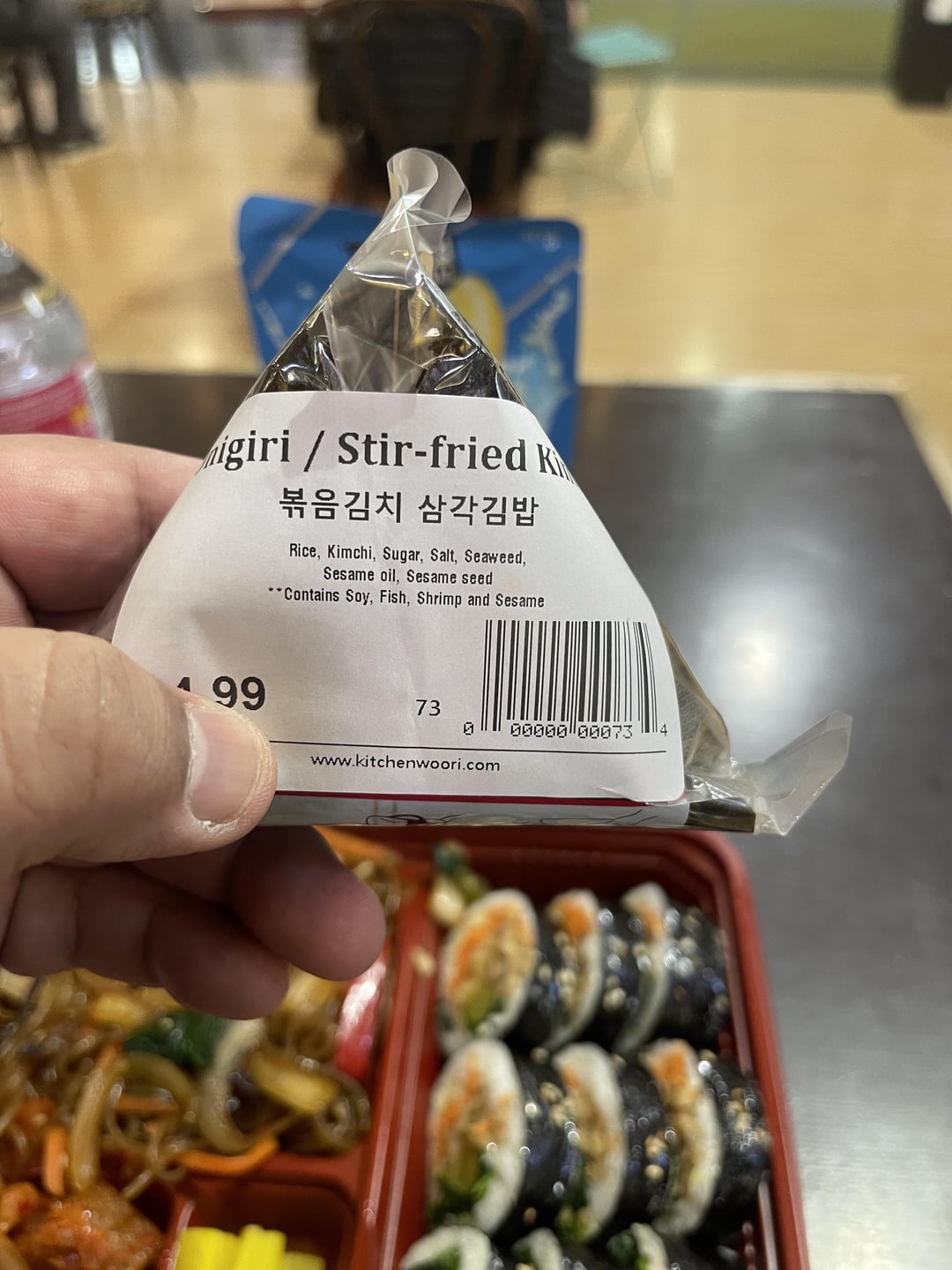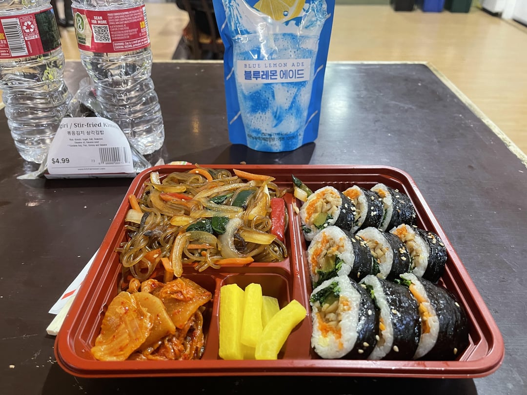 Korean brunch…sort of a Kimbap (fish cake) and Jap chae bento box, some blue lemonade and water, with a bokkuem kimchi samgak Kimbap…Woori Family Mart, Sf CA