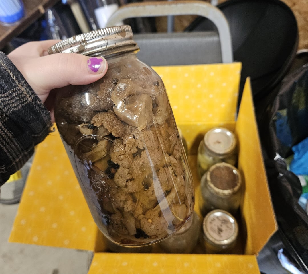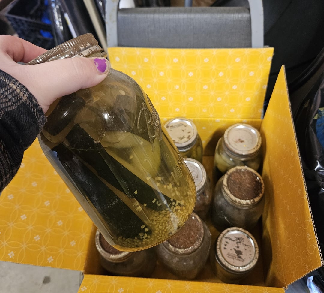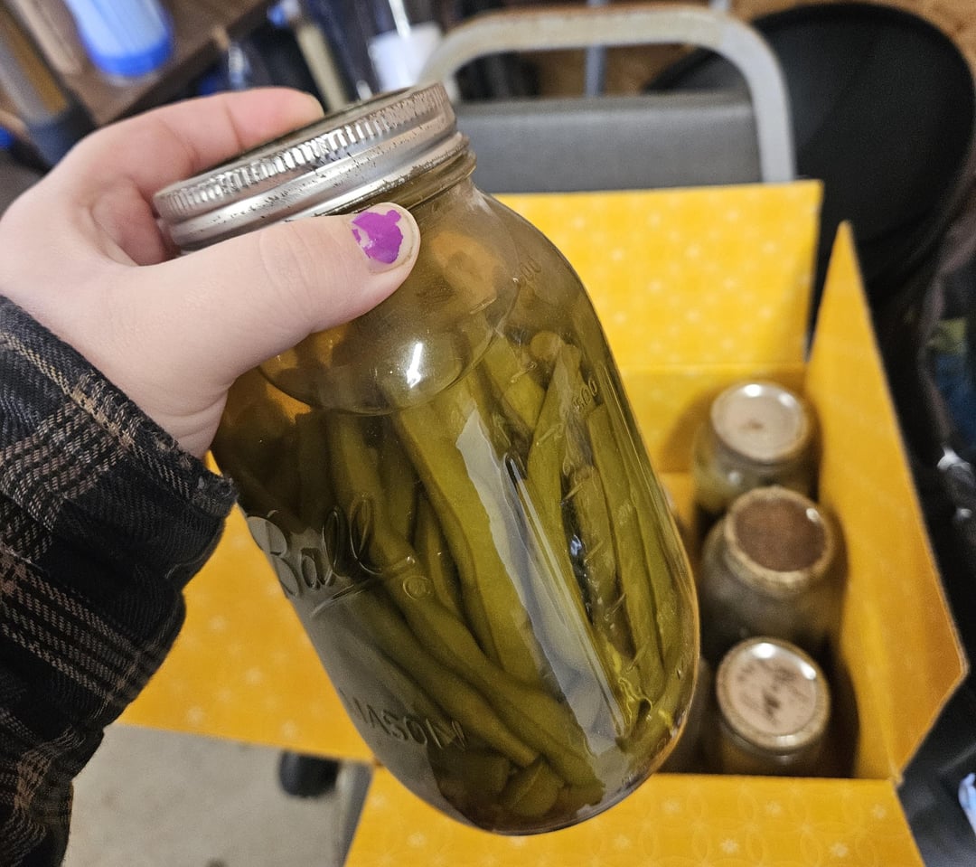 received these jars from a family friend, she said some of the jars may go back to 1945. Obviously not going to eat but the green beans and pickles don’t look half bad to me lmao