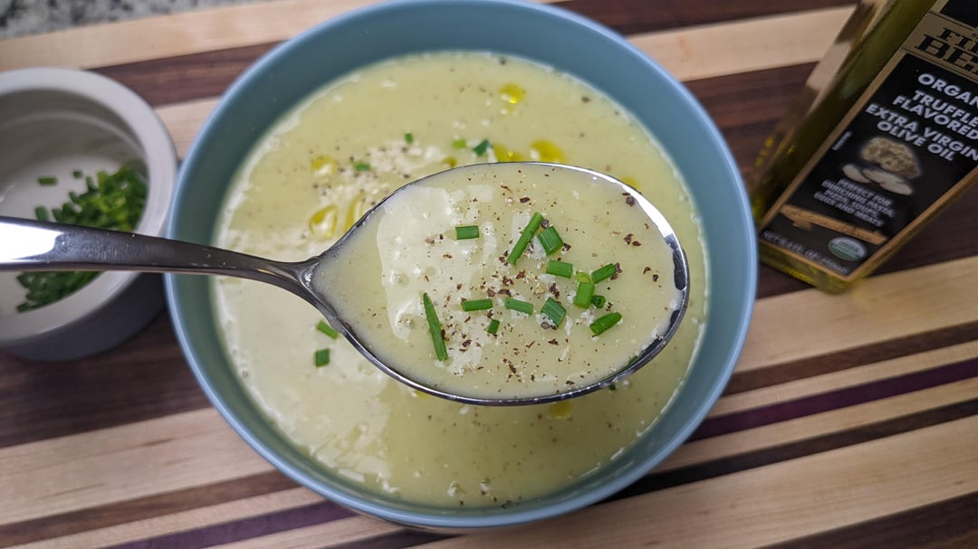 4. Pour yourself a bowl, and garnish with more Chives, Black Pepper, and a drizzle of truffle oil.