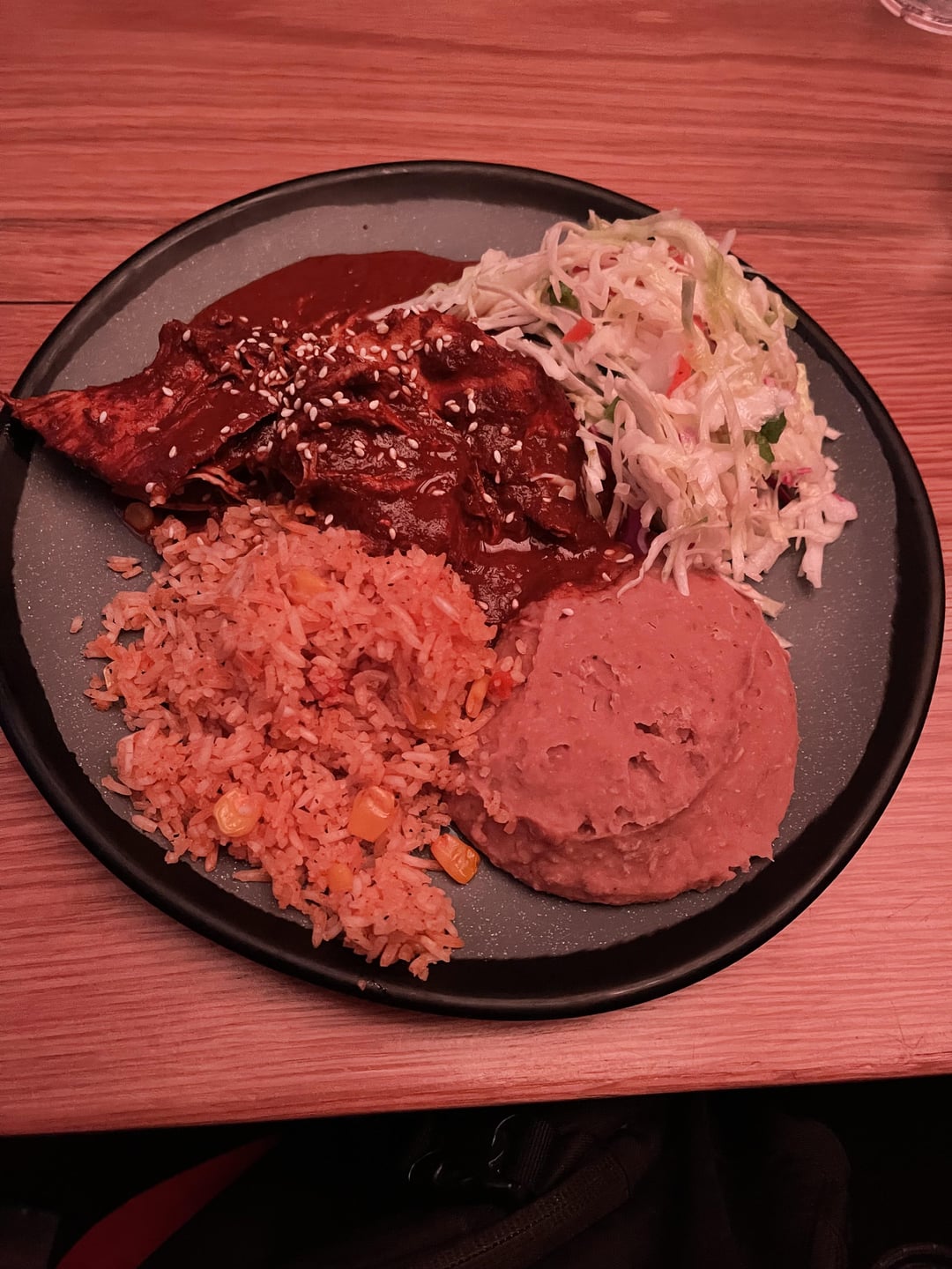 DiscombobulatedBus81 2 years ago whattup david! 🙃hope you had a good v-day brotha!ill try and give my 2 cents on this here…chicken (roasted; thigh; ≈150g or ≈5.5oz cooked) ≈325mole sauce (≈1/4 cup or ≈70g) ≈100mexican rice (≈1 cup or ≈100g) ≈200refried beans (≈3/4 cup or ≈150g) ≈175mexican slaw (≈1 cup) ≈75sopapilla (1 large; ≈40g) ≈175-200running estimate: ≈***1050-1075 calories!*** 🔥