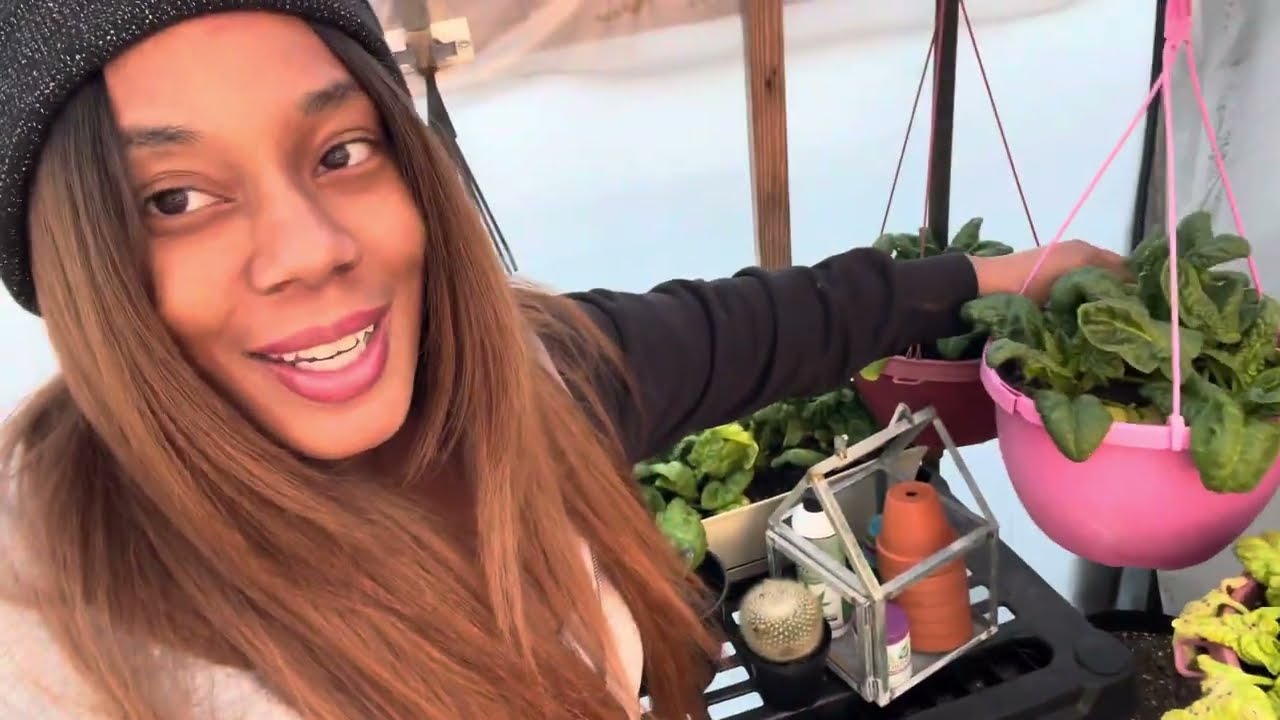 Right so now we are inside of my little greenhouse and I want to harvest some spinach so with the spinach you want to just Harvest from up under the plant cuz you want it to keep coming back okay so we’re just going to harvest around the