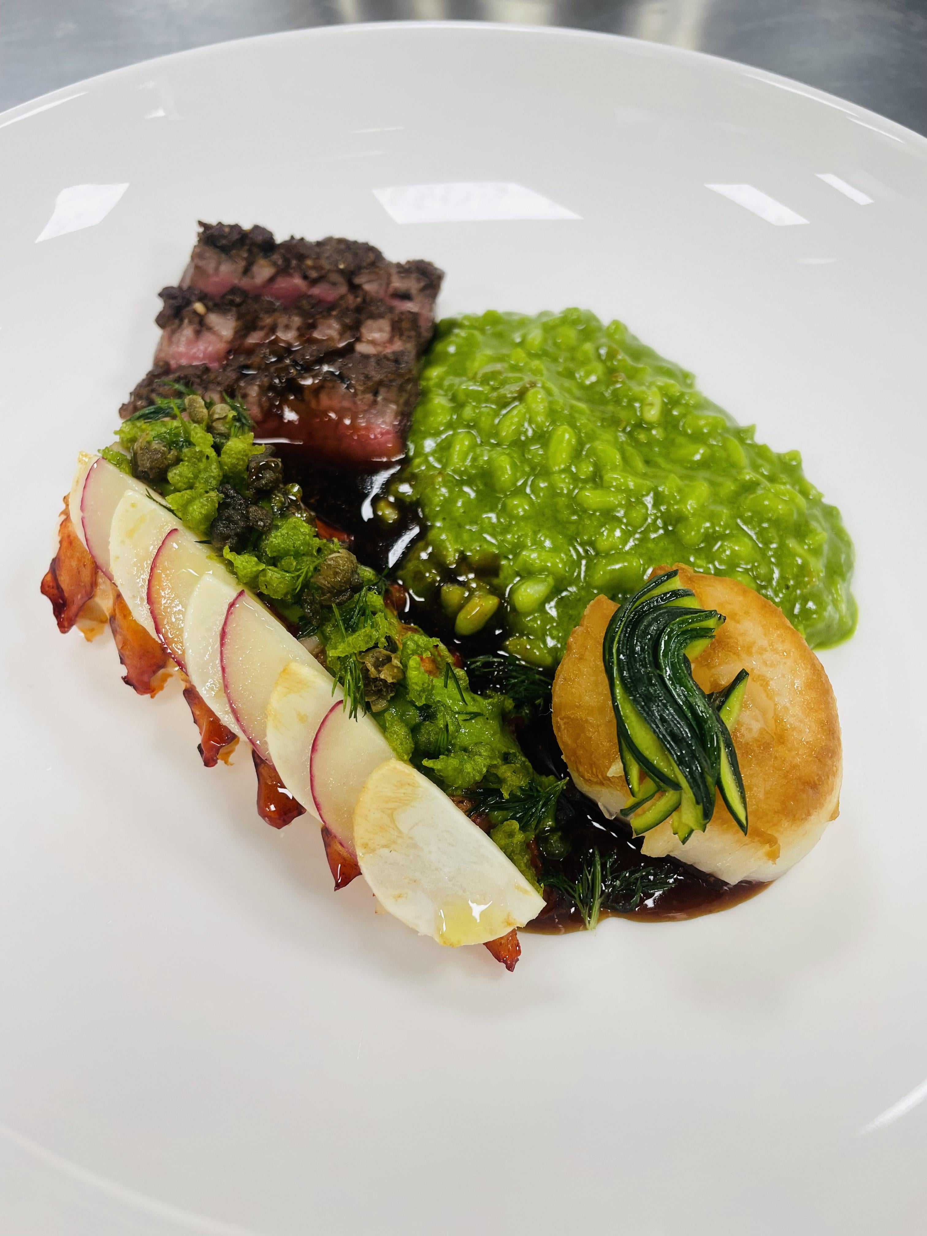 >!If it was me, the risotto would be centred and laid down first. Put the radishes underneath the protein to show off the meat and the beautiful herb salad mixture, do the same with your scallop garnish, just move it down to provide a visual flow from the green herb salad around the side of the scallop. Steak sits at the top of the plate, about where it is, but taking up way more of that risotto border. Make it the standout, right at the 12 position, with the scallop at 4, and the tail at 8. Swoop of Demi around, breaking up the risotto a bit more. All in all it should just be a bit tighter. Lastly, I don’t see anything on this plate that screams carrot reduction – either make it more apparent or cut it from the description.!<