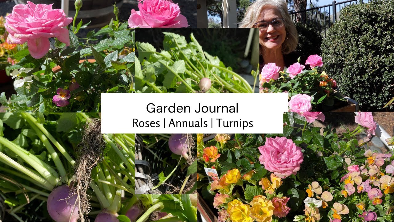 Today I’m potting up some pretty annuals, a miniature rose bush and harvesting some root vegetables.
