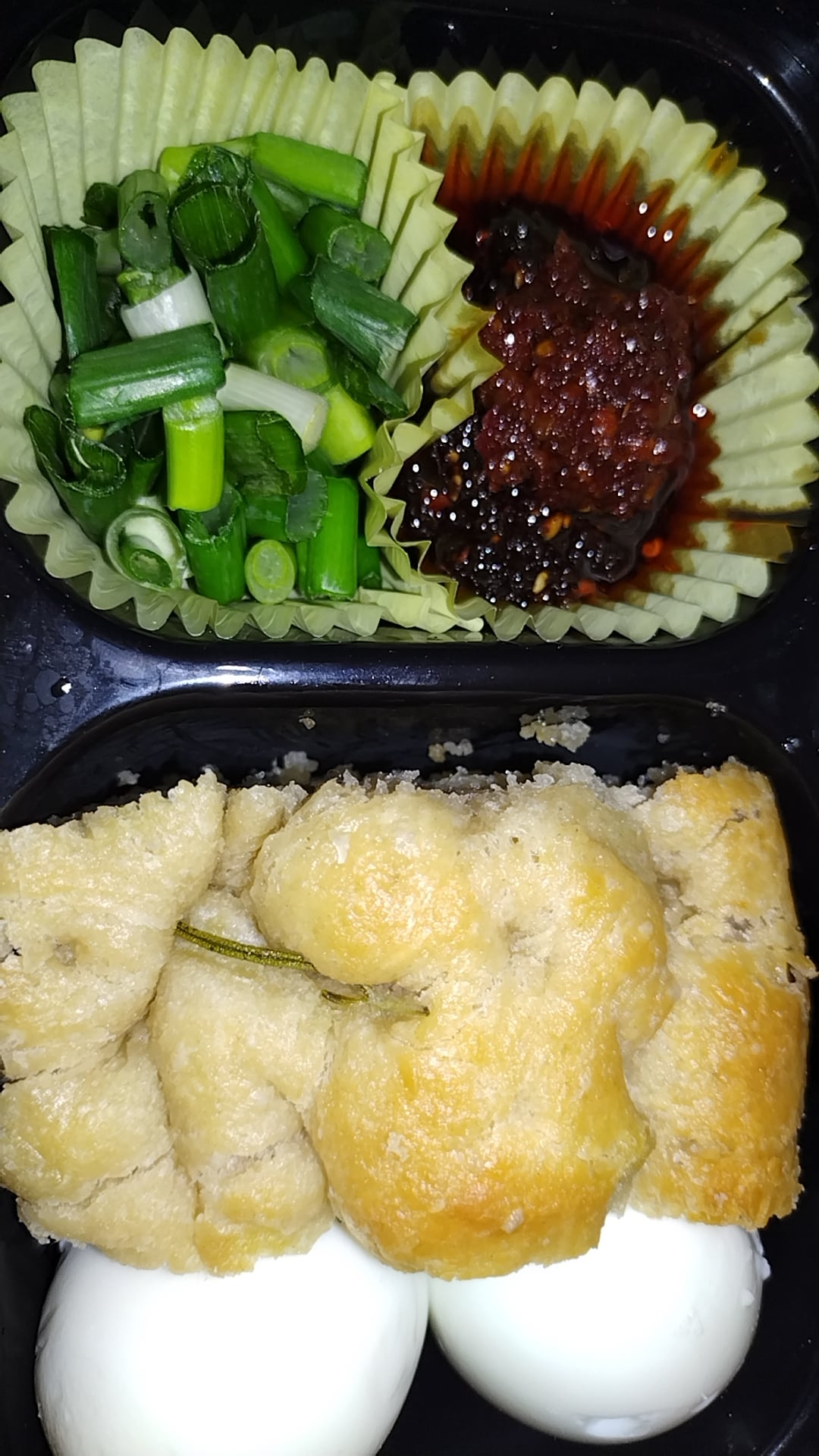 Green onions, chili oil and super black bean