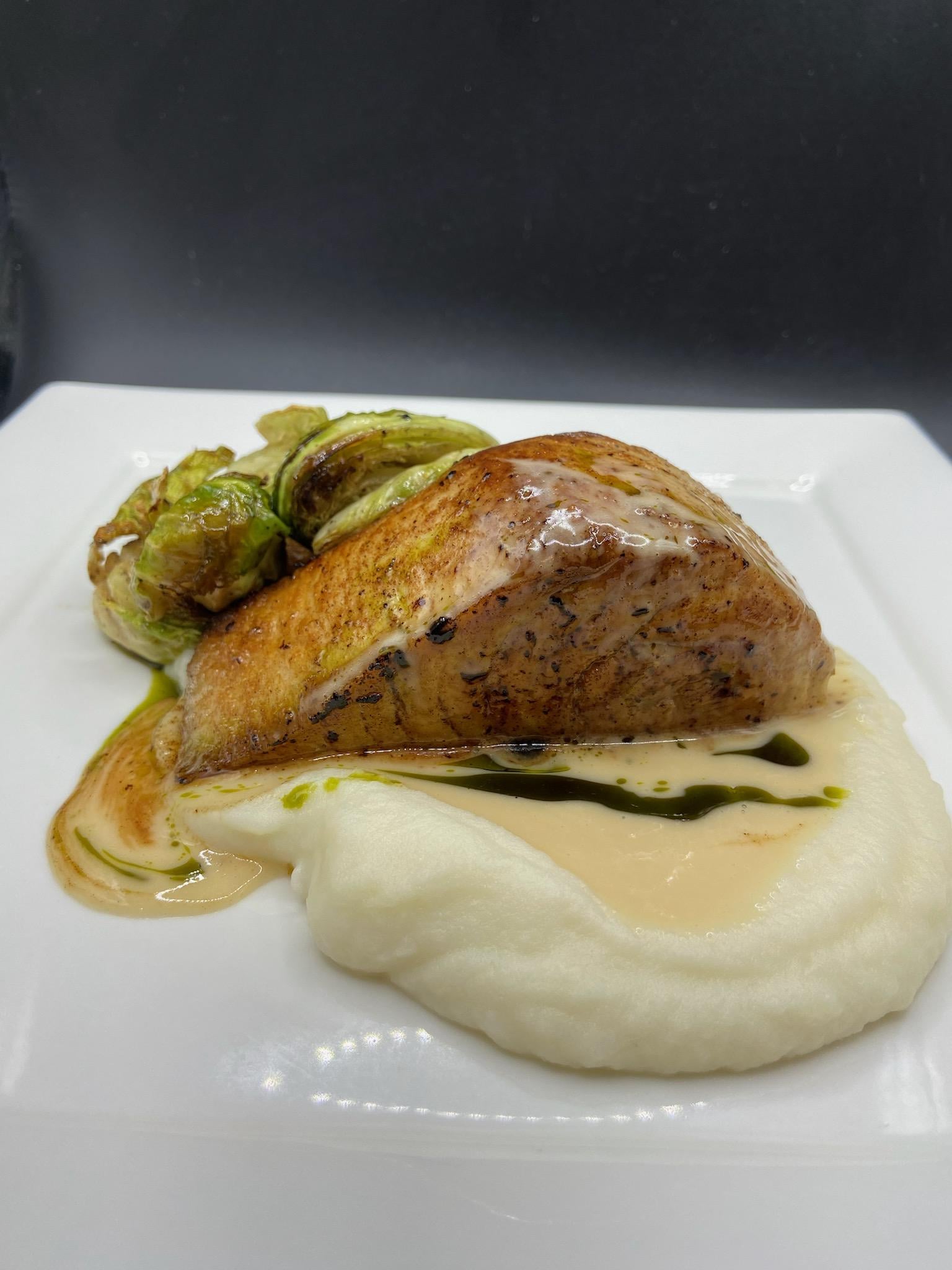 I don’t eat fish, but the potatoes, Brussels sprouts, and sauces look quite good.