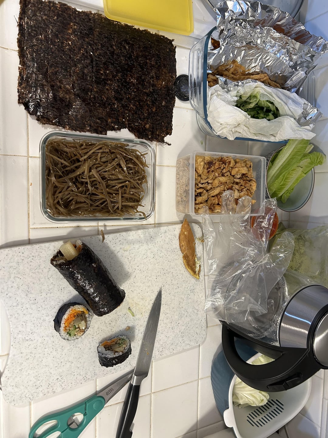 I recently tried Trader Joe’s Kimbab and wanted to make one at home but it took 4 hours to prepare 7 ingredients… yet 2 more to go!!! I got too tired so I made one with what I have. It was amazing!!
