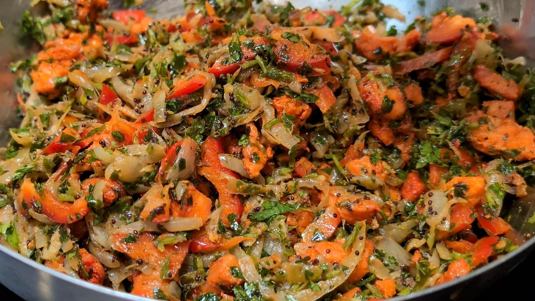 Add the cooled onion mix to the cooled chicken. Mix in sliced red peppers, finely chopped coriander, and lemon juice.