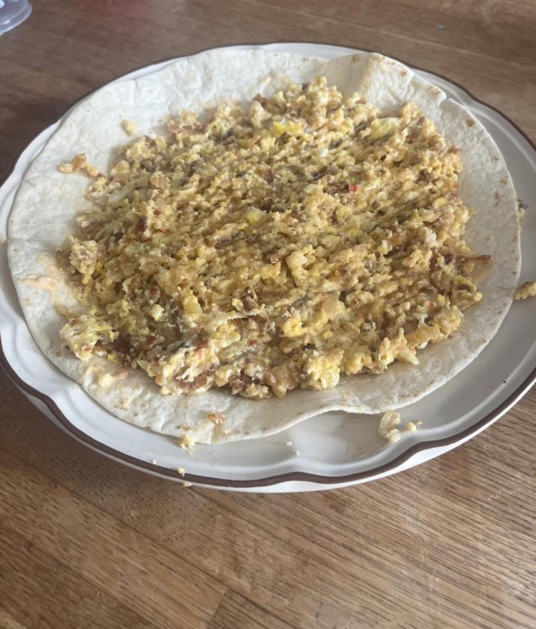 You could very easily make this not look like slop by skipping the mash it all up together step… Tortilla -> Hash browns -> Eggs -> Ranch, fold. It’s just a breakfast burrito, what did it ever do to you?