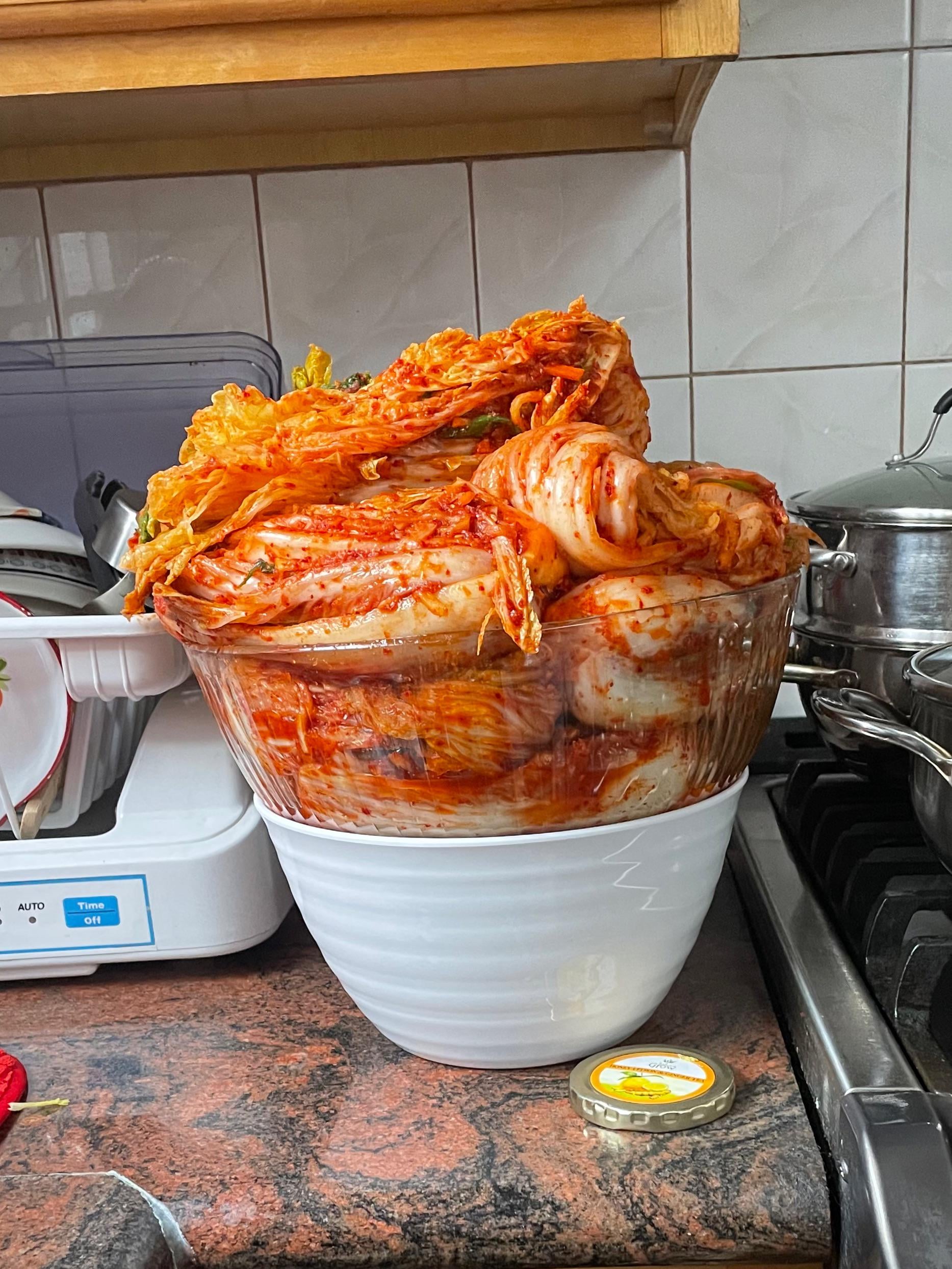 I had placed it in another bowl to elevate the kimchi because my food hound of a dog wanted to eat the it 😂
