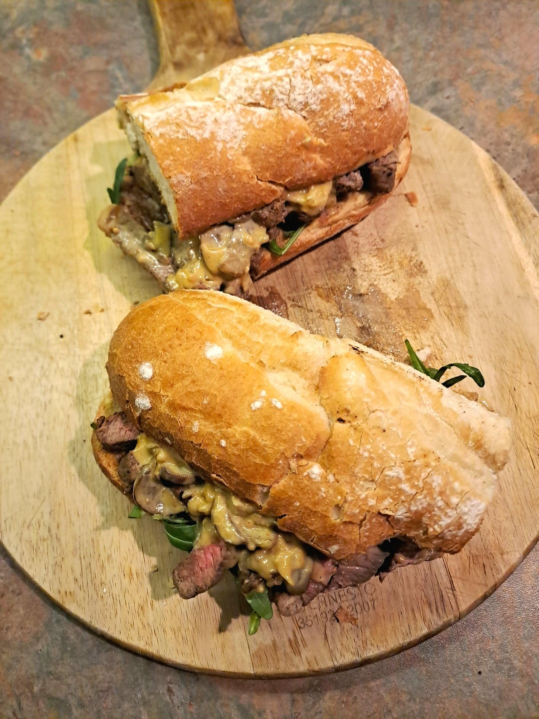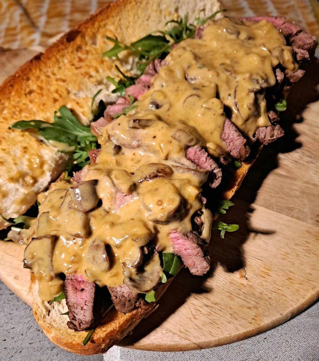 [Homemade] Steak Sandwich with rocket and topped with a creamy mushroom sauce