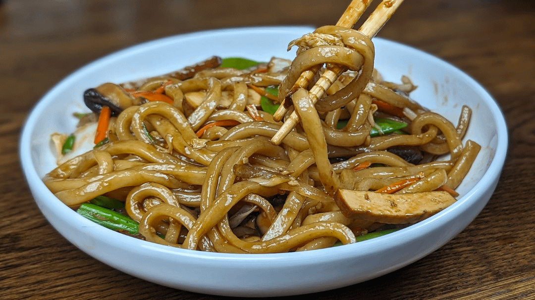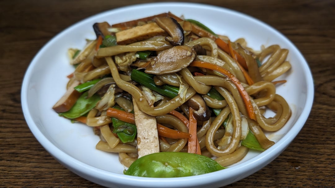 * 3 Packages of Frozen Udon * 4 Oz of Firm Tofu * 2 Cups of Shiitake Mushrooms (4-5 caps Sliced) * 2-3 Cups of Napa Cabbage, chopped * 1 Carrot, julienne * 1 Cup Snow Peas * 1 Large Yellow Onion, radial cut * 4-5 Green Onion Stalks, both white and green parts * 1 Tbsp Garlic, minced * 2 Thai or Birdseye Chilies * 2-3 Tbsp. Neutral Oil
