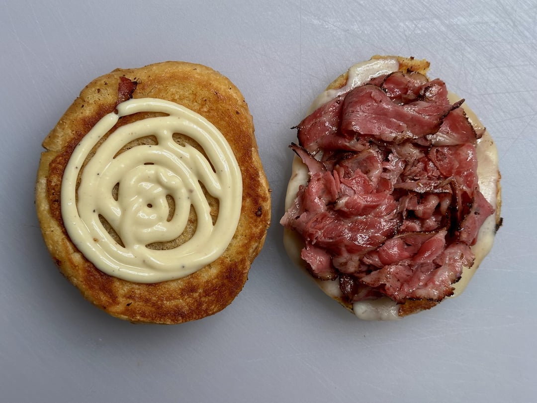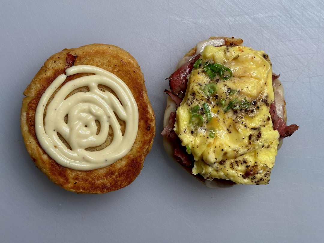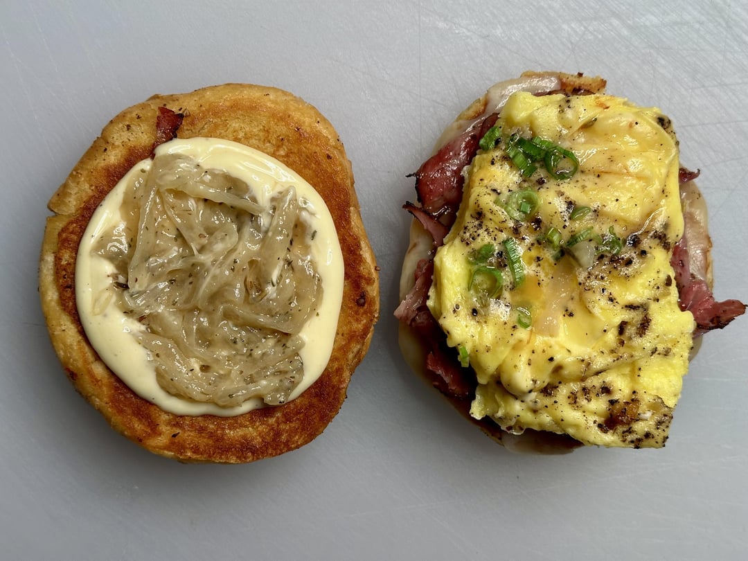 Scrambled egg, pastrami, fontina, caramelized onions, and homemade maple mustard aioli on a buttered and griddled Italian potato roll.