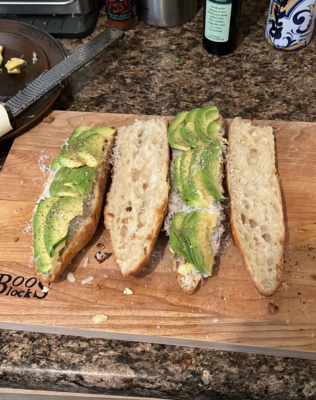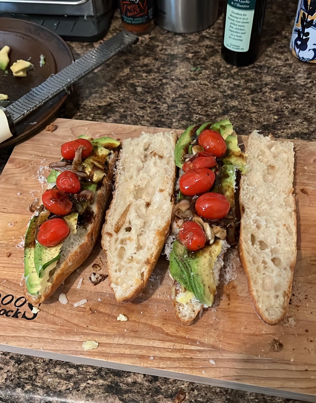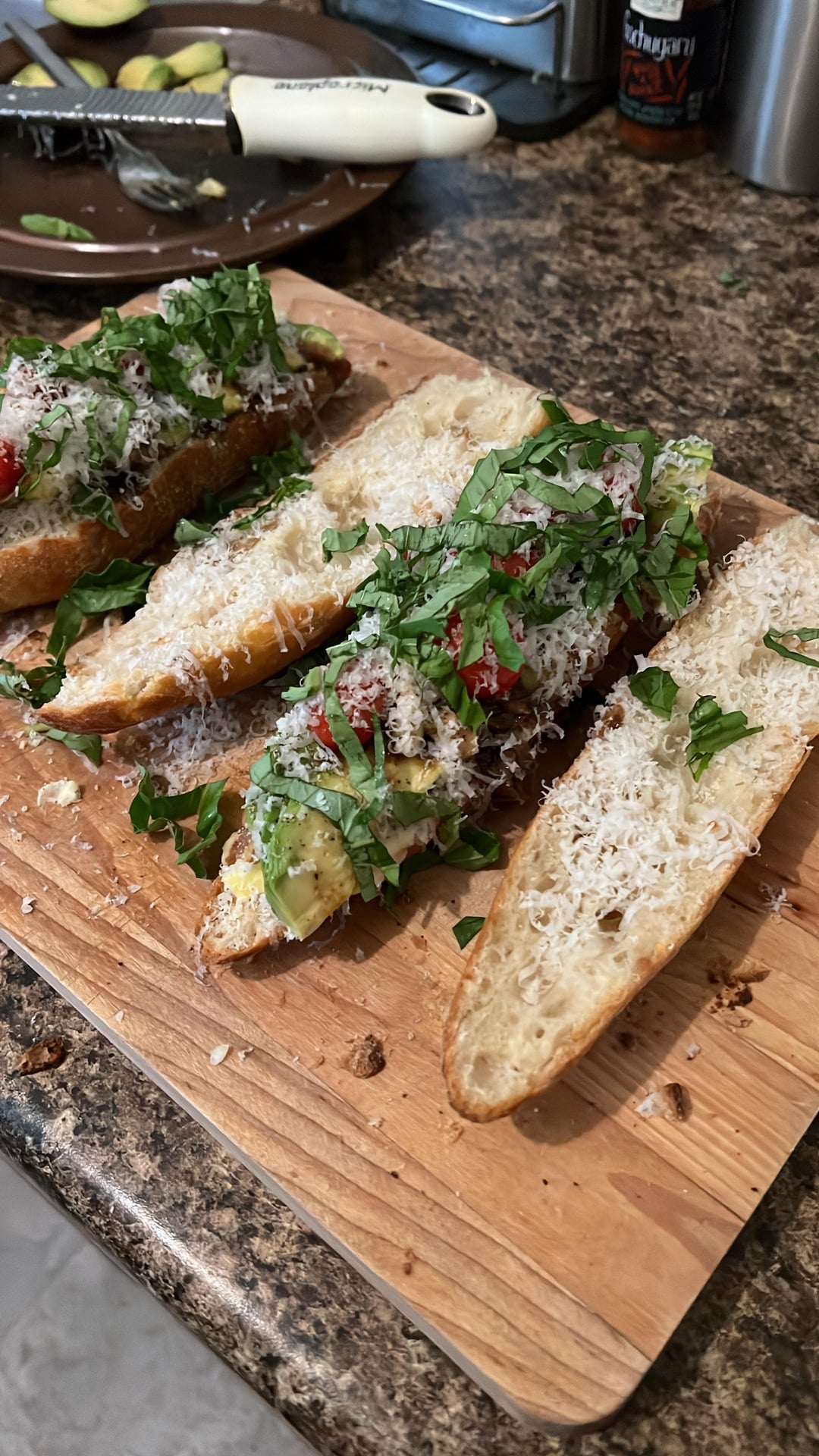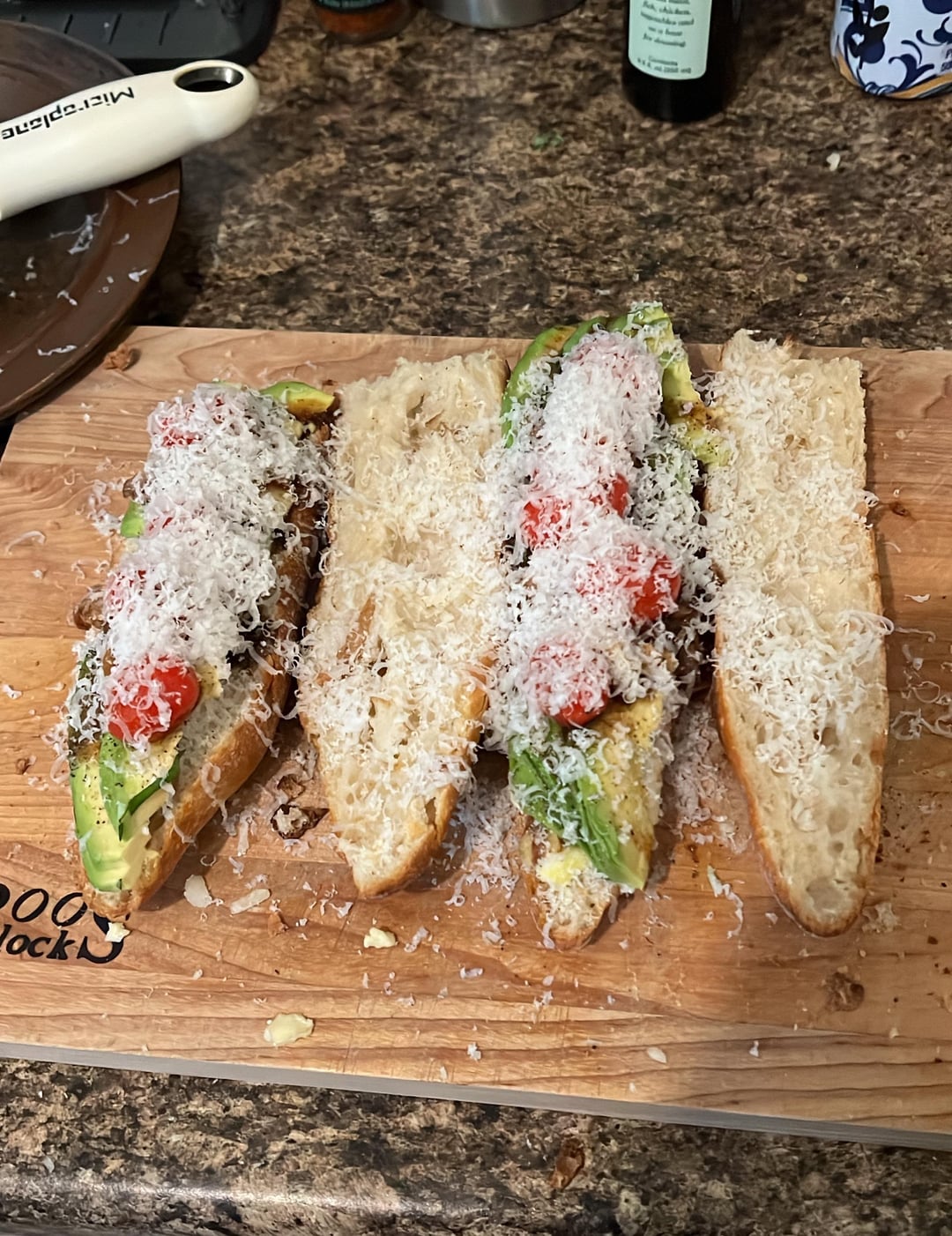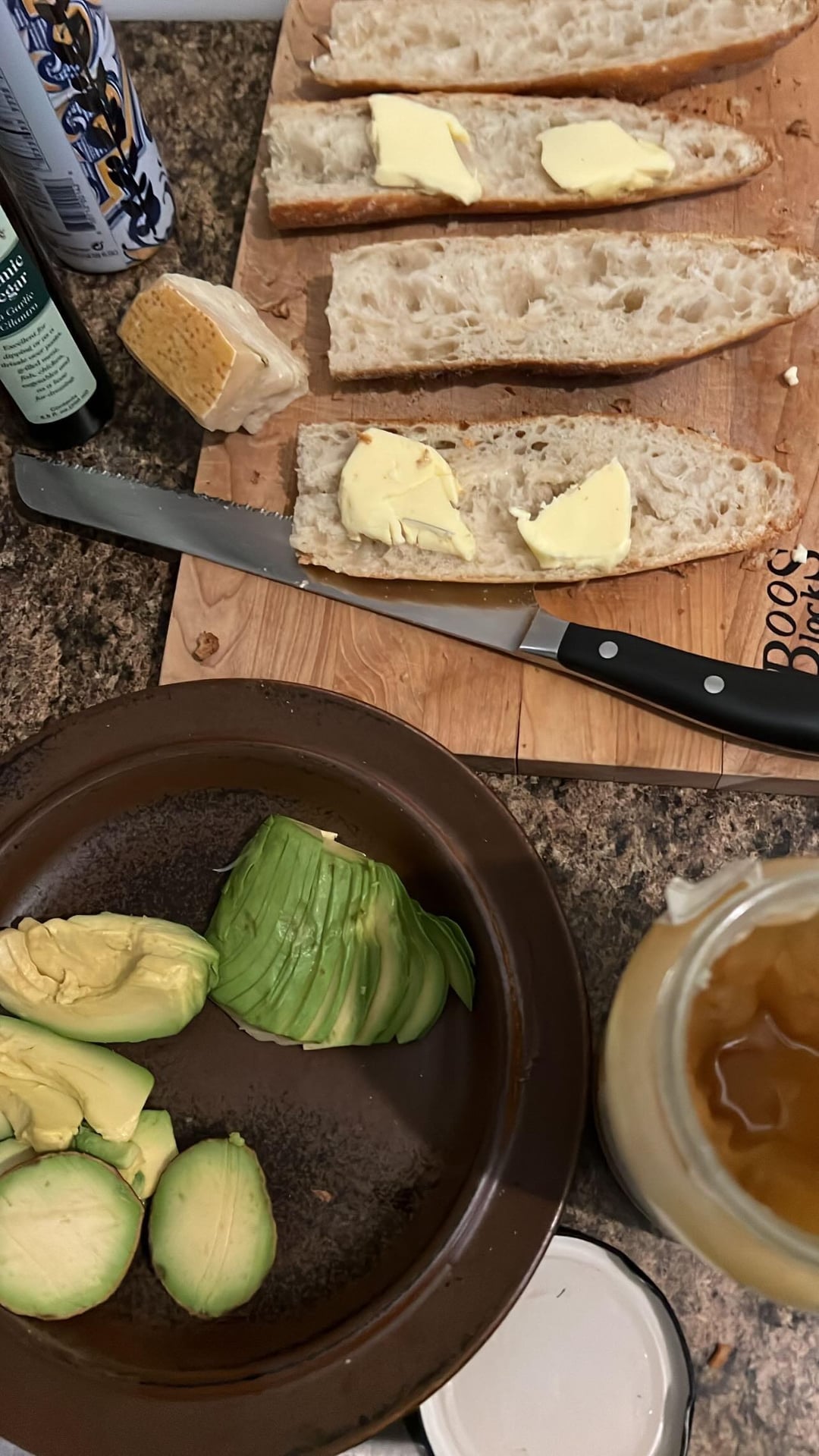 Baguette with crushed walnuts, isigny spring butter, dates, dressed avocado, fermented peppercorns, 2 layers of grated parmigiana reggiano, and a cherry tomato, shallot, garlic, coriander, gochugaru, isigny spring butter, lehua blossom honey, garlic cilantro balsamic sauce