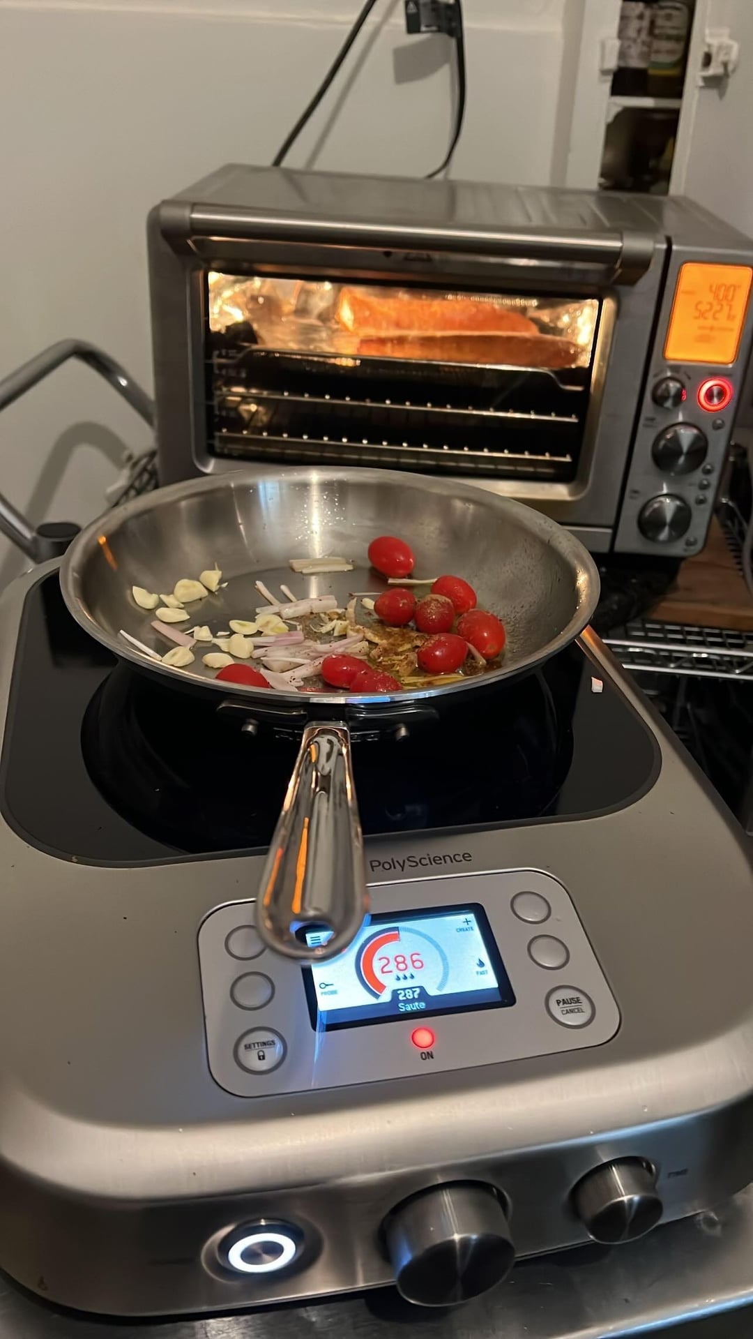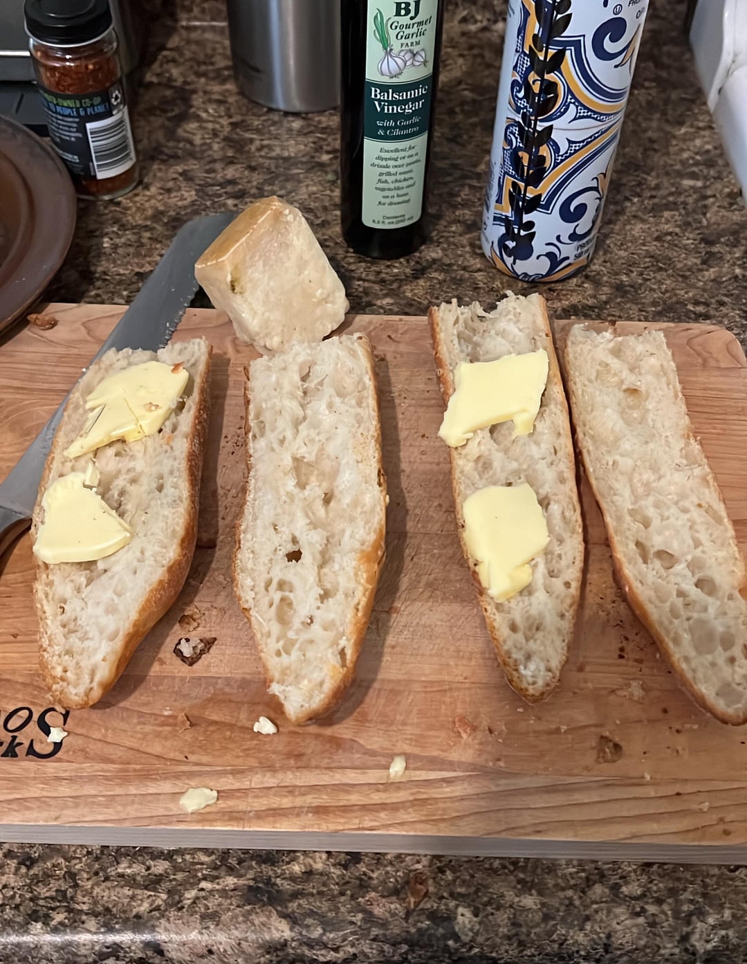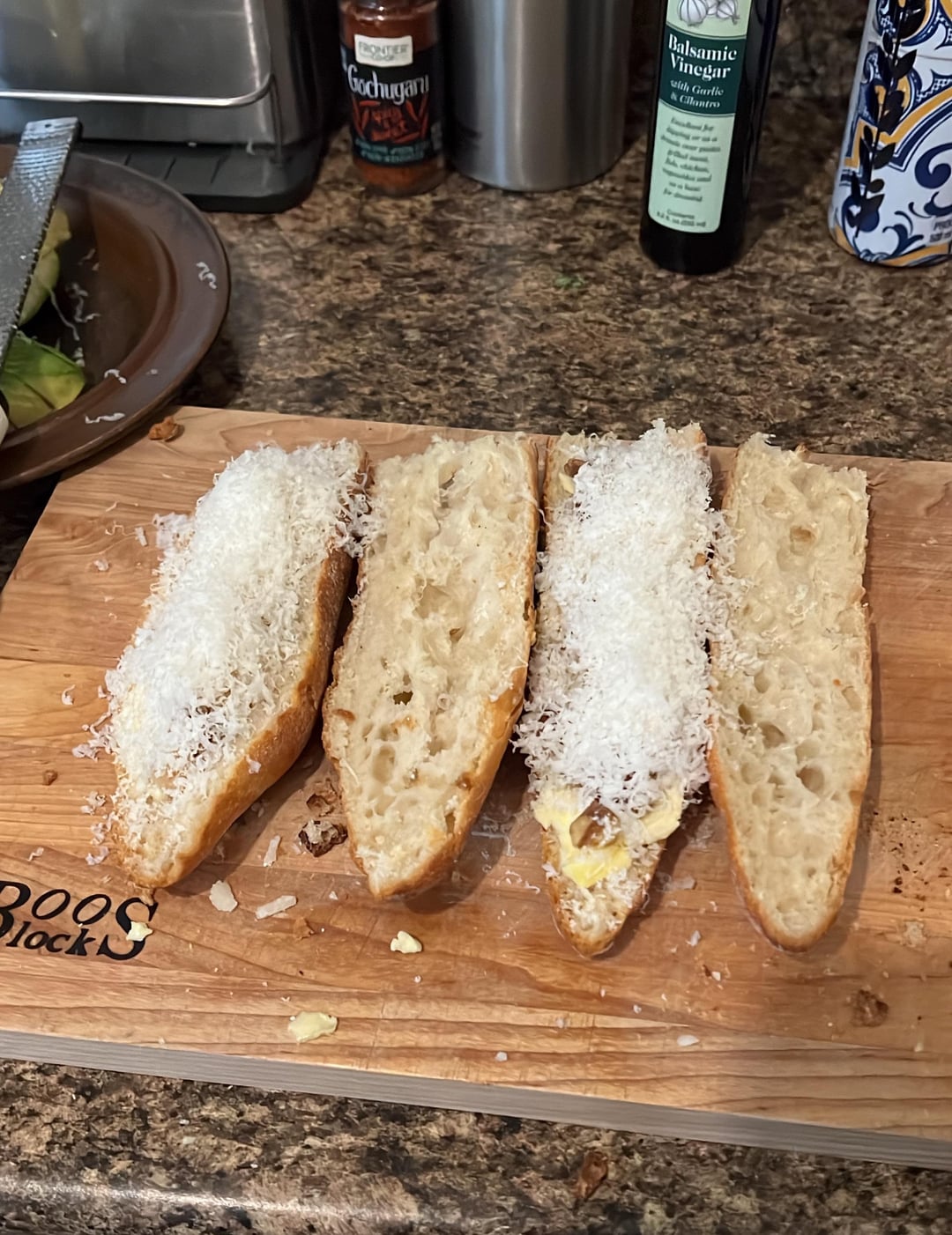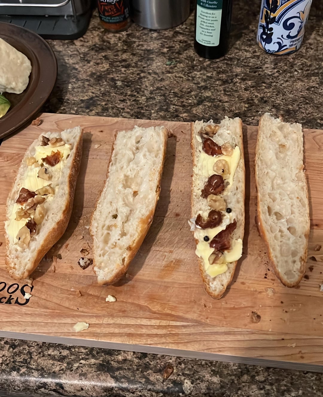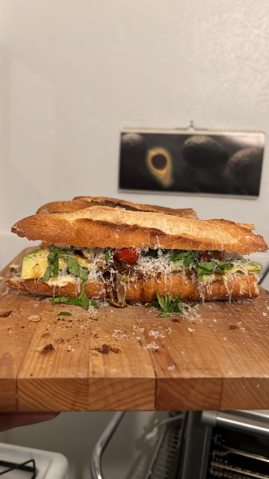 Baguette with crushed walnuts, isigny spring butter, dates, dressed avocado, fermented peppercorns, 2 layers of grated parmigiana reggiano, and a cherry tomato, shallot, garlic, coriander, gochugaru, isigny spring butter, lehua blossom honey, garlic cilantro balsamic sauce