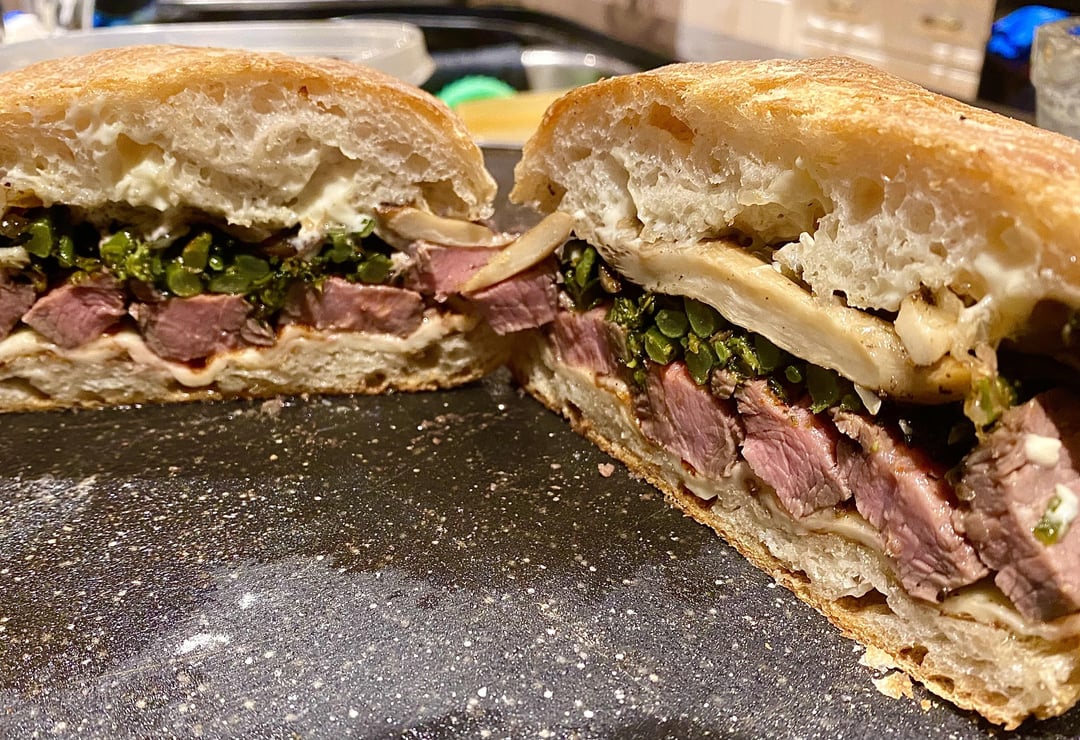 Marinated flank steak with charred broccolini, sautéed oyster mushrooms, caramelized onions, Queso fresco, and truffle mayo on a Portuguese bun.