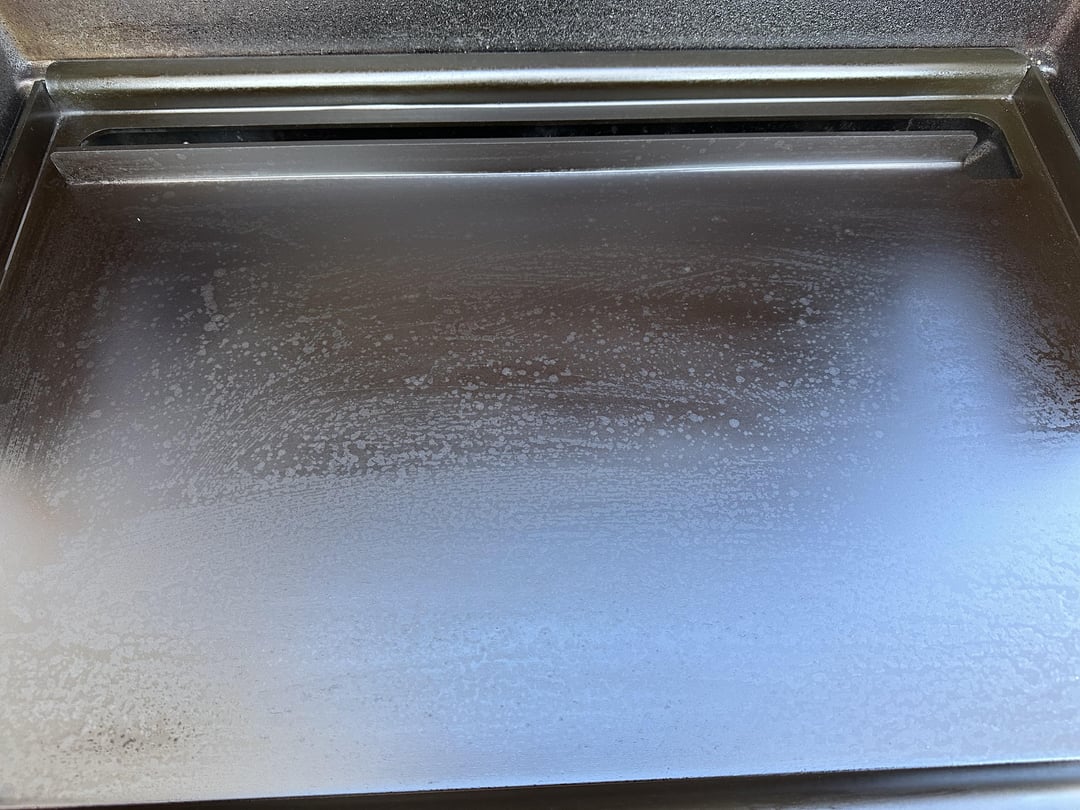 Excessive oil. Heat it up and scrape some off, then start cooking on it. I like to hit the store and get some grease burgers (85% lean = FAT) Cook them and coat the griddle and then crank up the heat to season the thing. Next time you cook on it you just toss some salt on and wipe it down with a paper towel. Repeat that a few times and you won’t be able to get anything to stick to it.