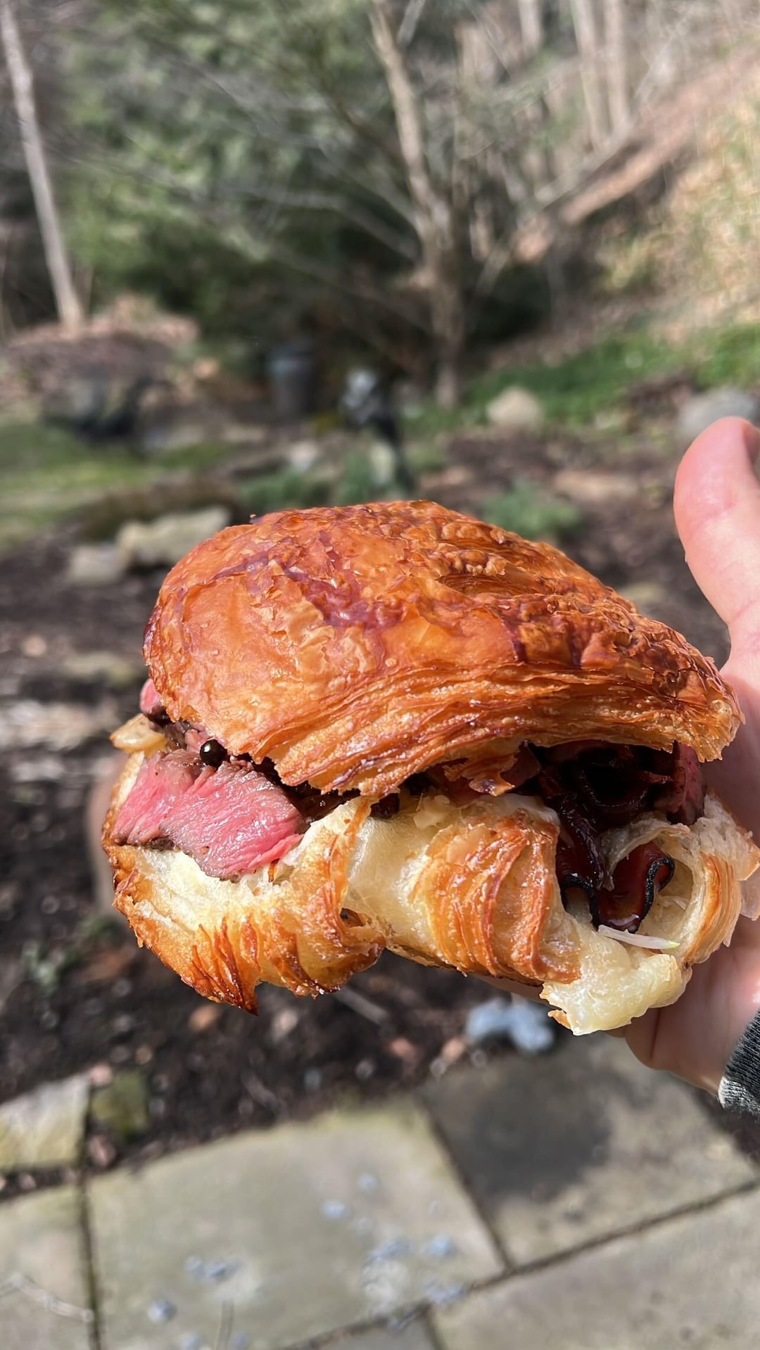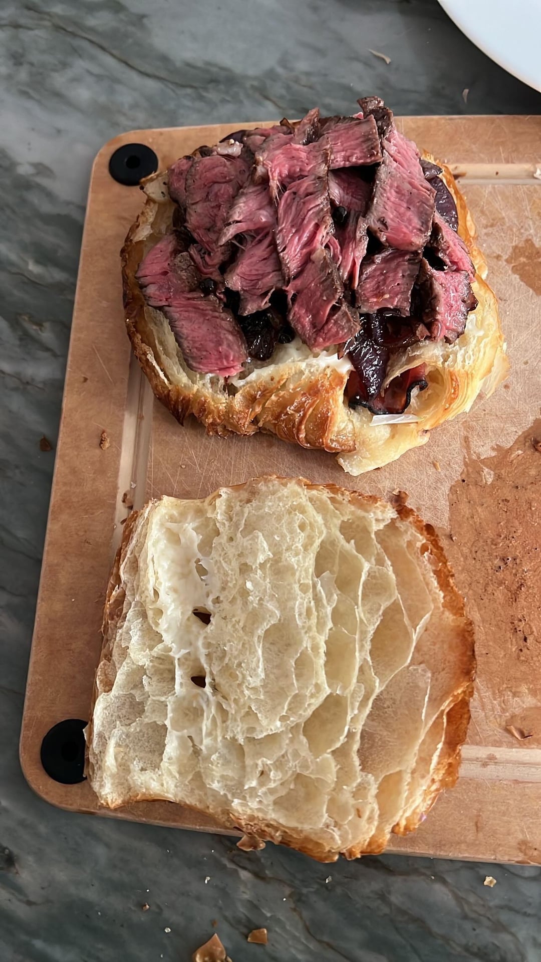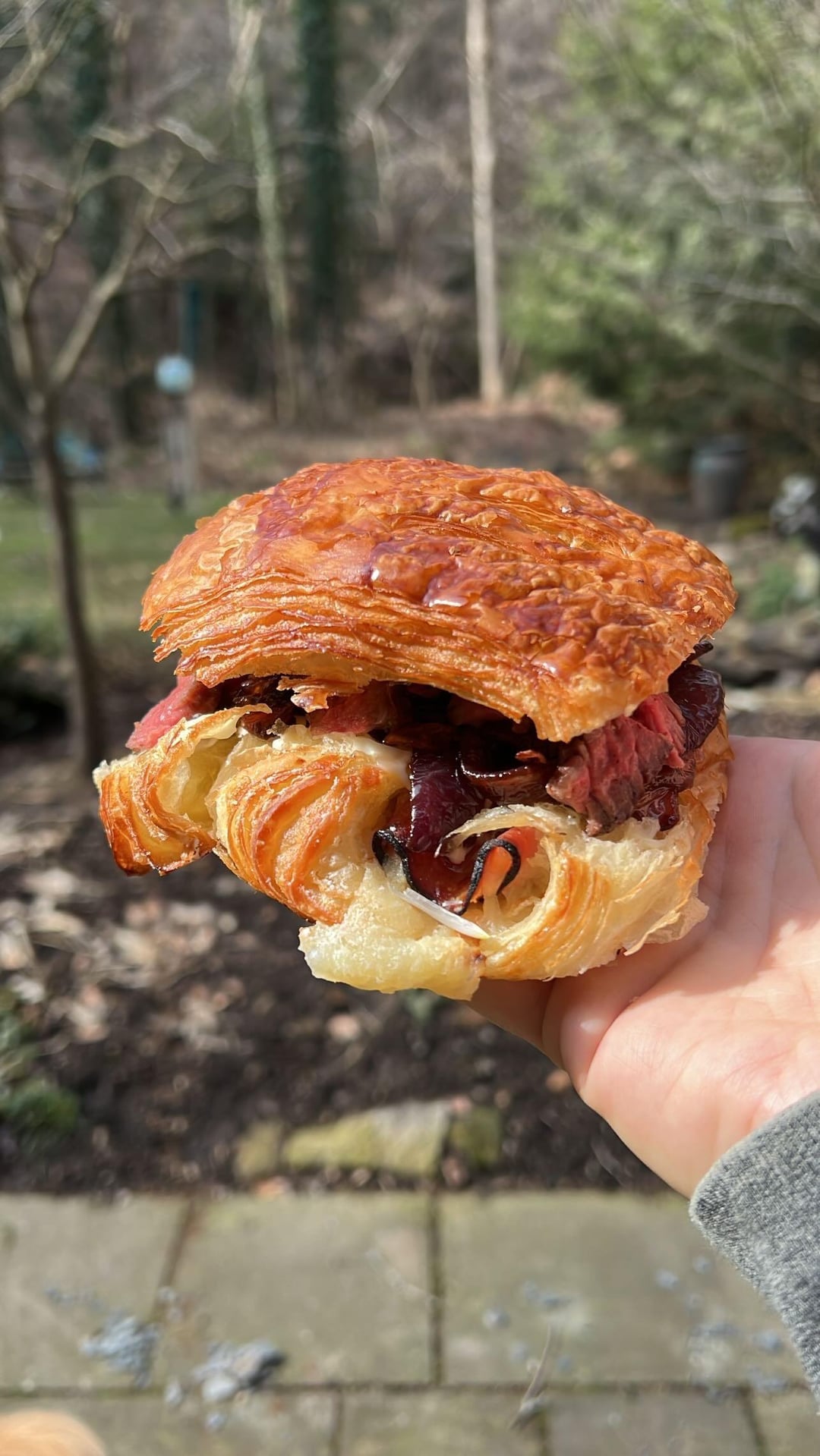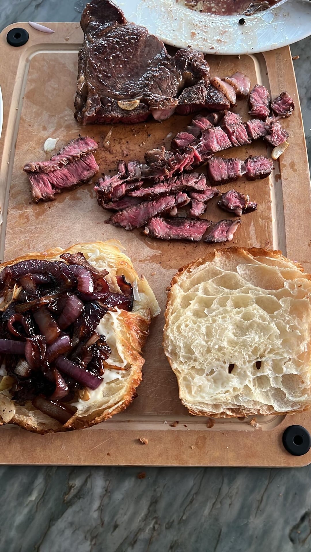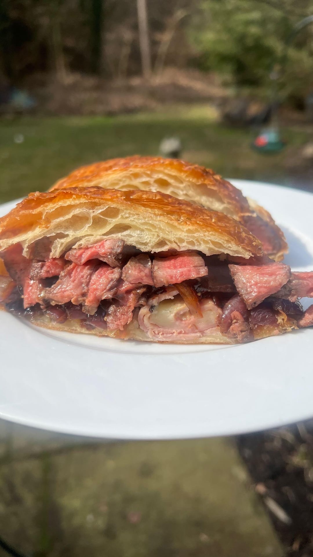 Grilled Delmonico ribeye ham and Gruyère croissant sandwich with sir Kensington mayo and caramelized balsamic onions
