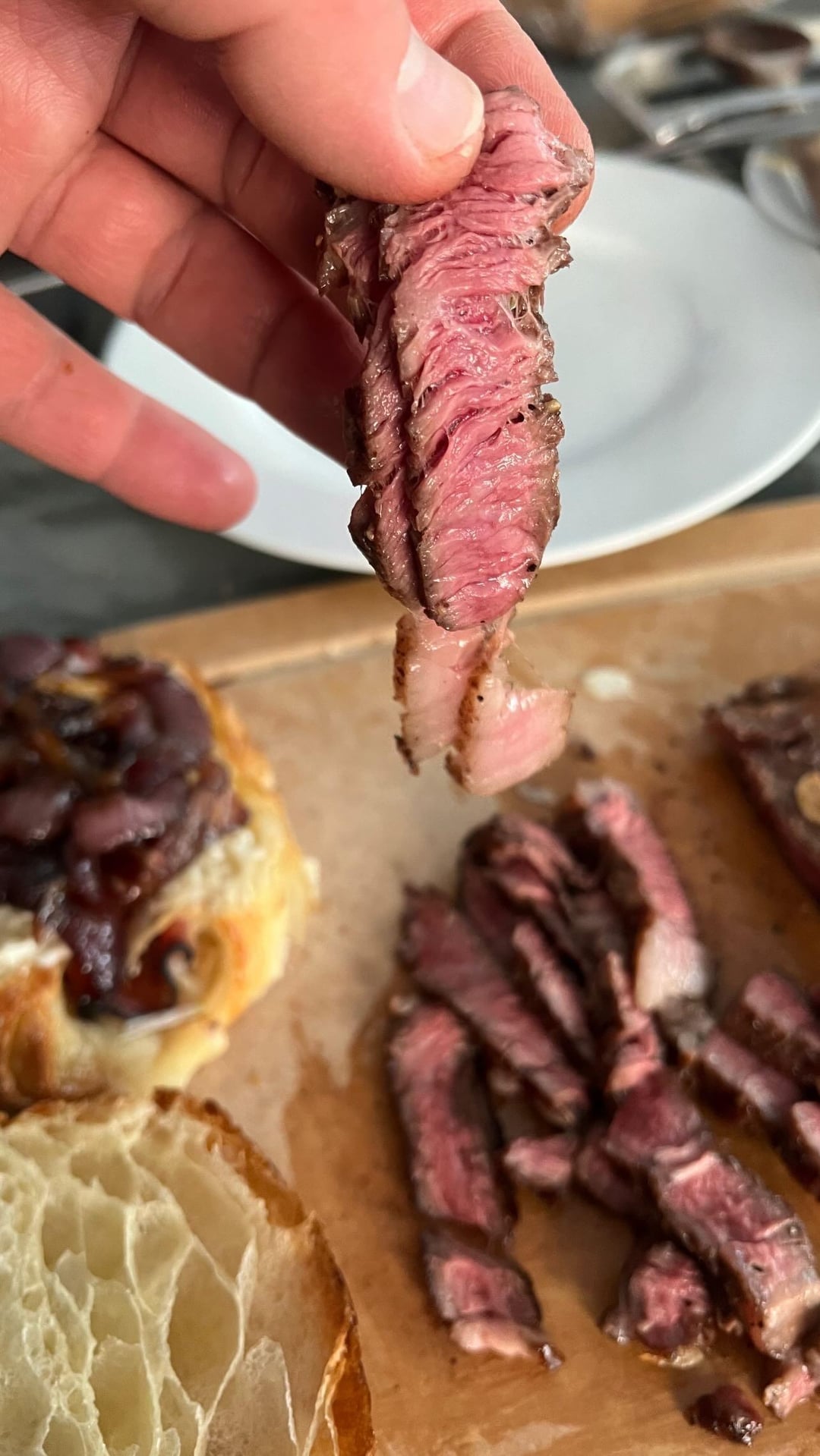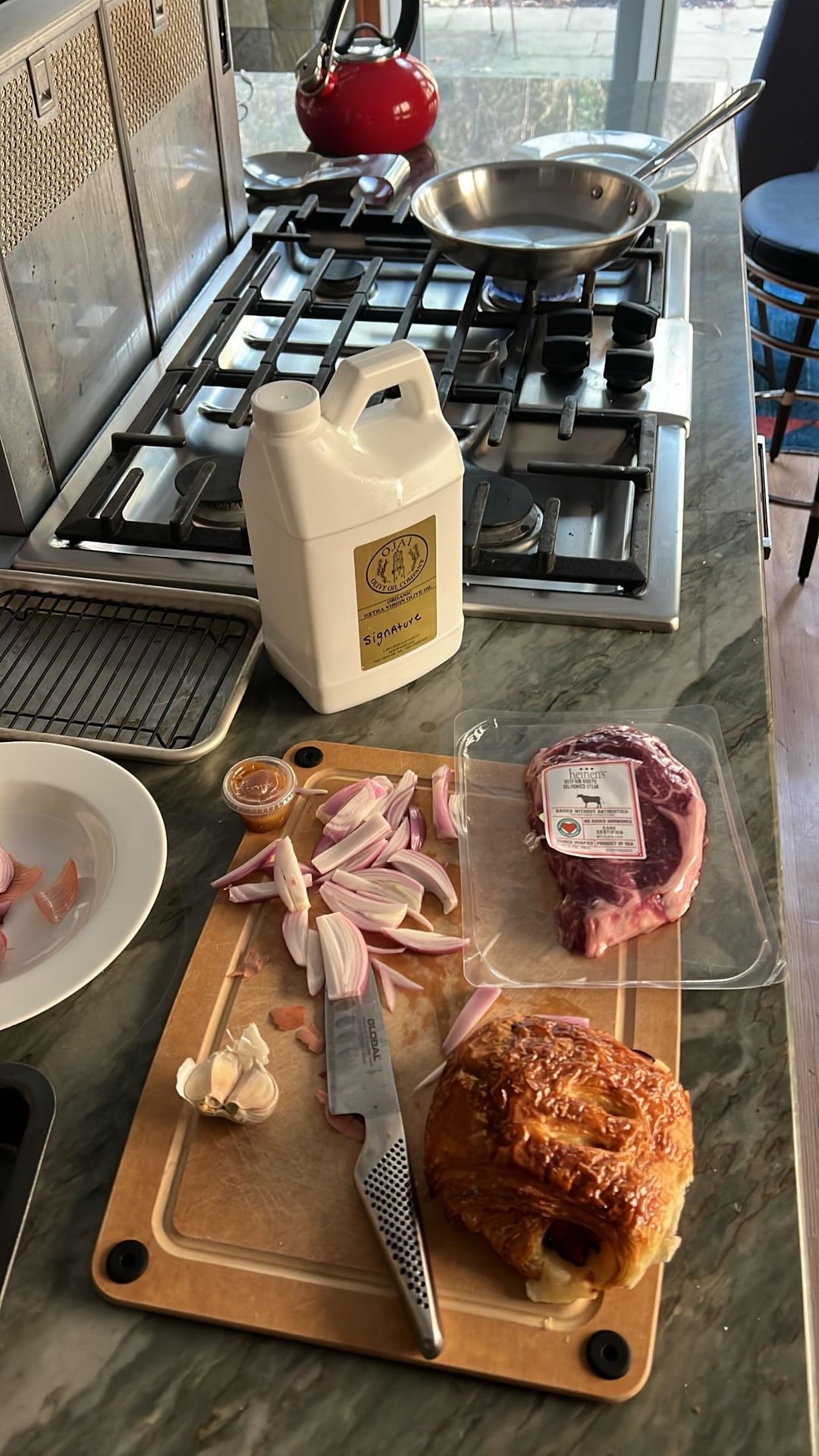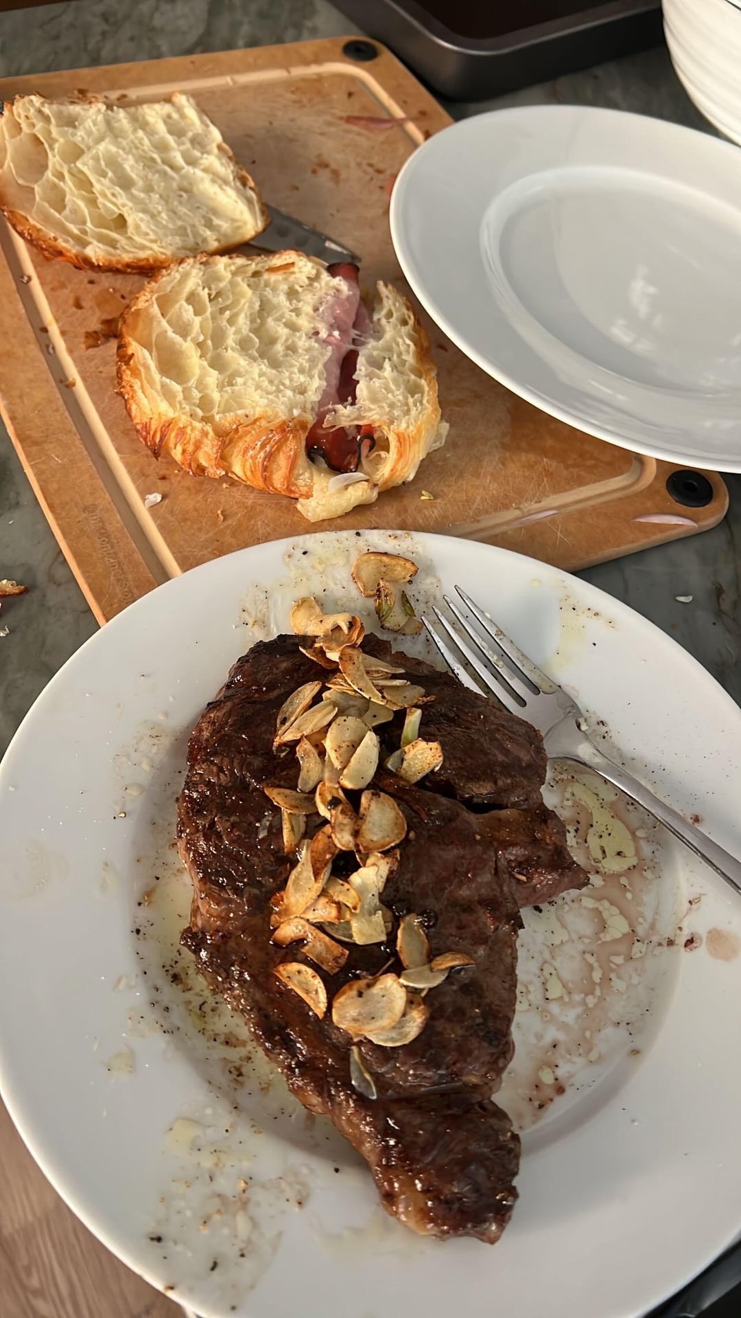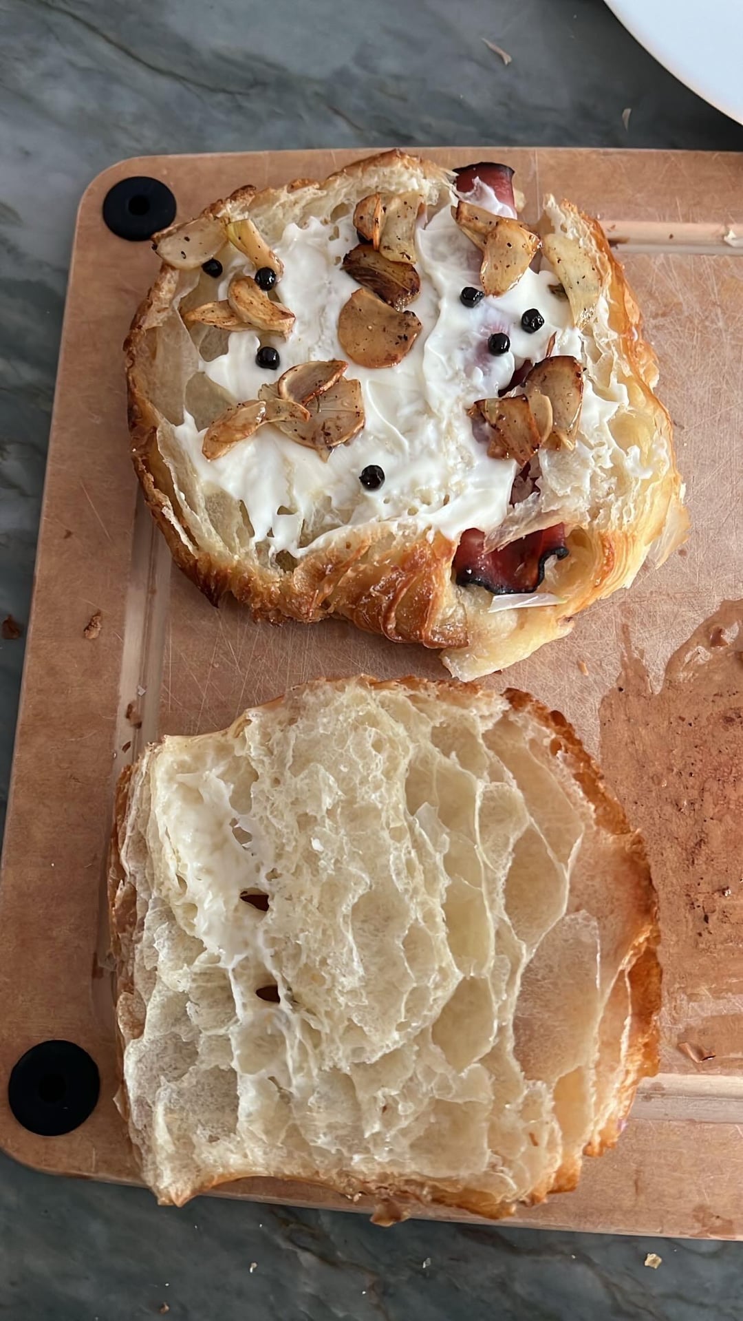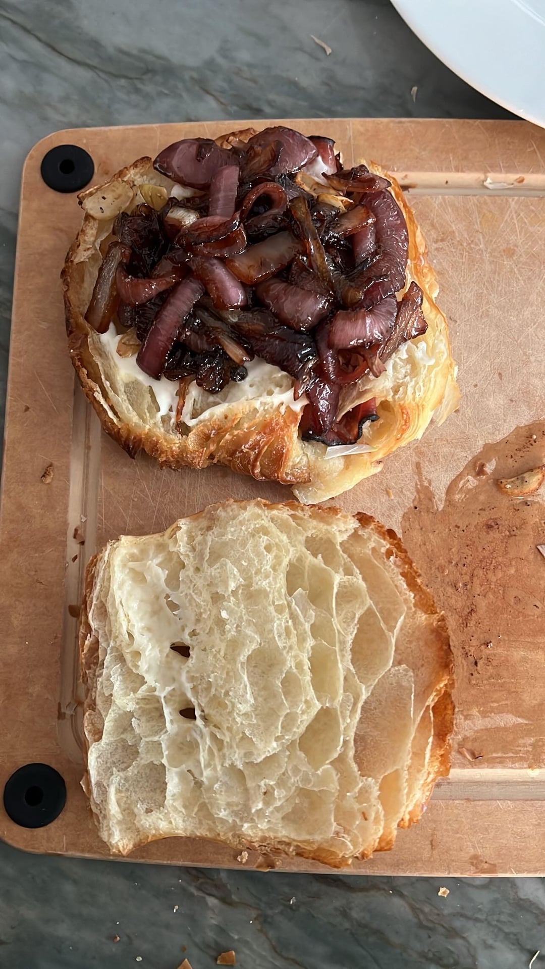 Grilled Delmonico ribeye ham and Gruyère croissant sandwich with sir Kensington mayo and caramelized balsamic onions