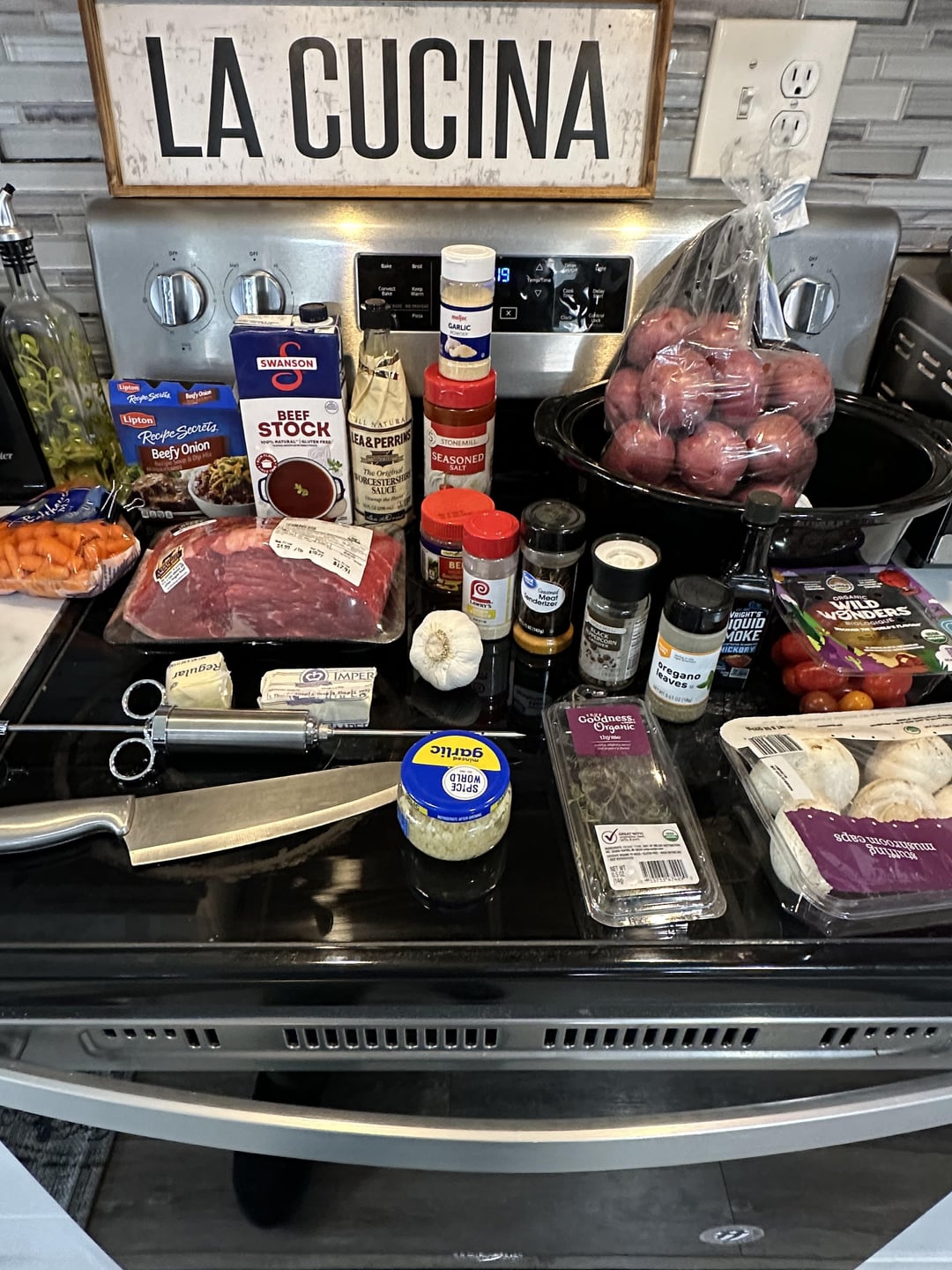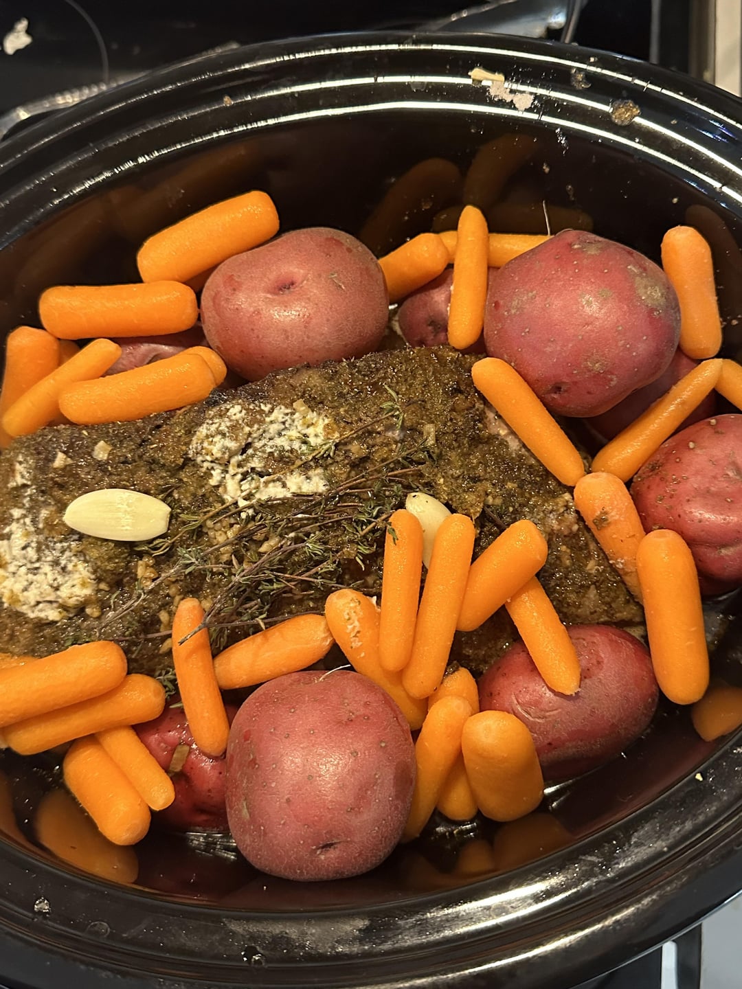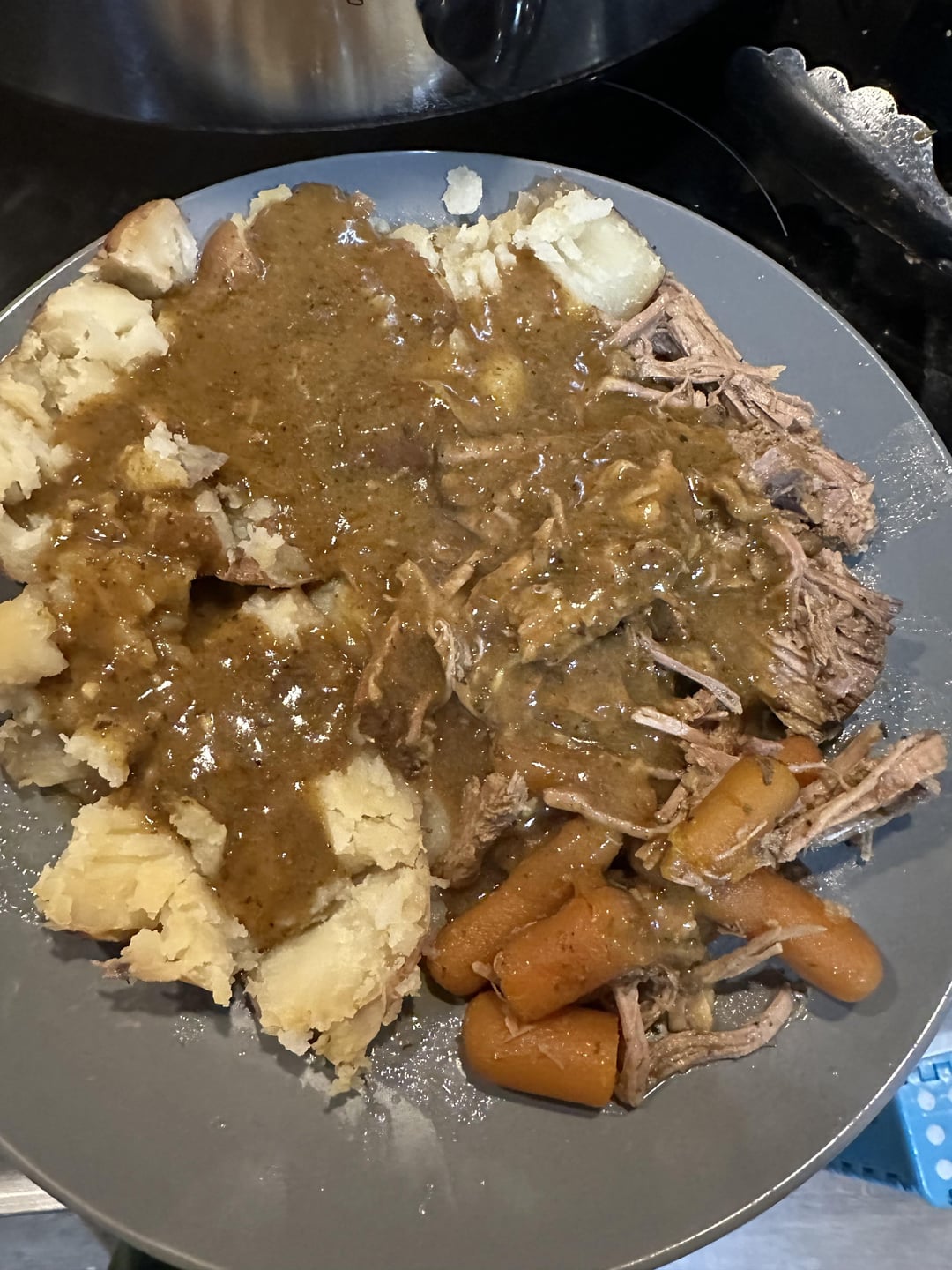Pot Roast, red skin potatoes, carrots with homemade gravy and dinner rolls from scratch.. first time making rolls from scratch.