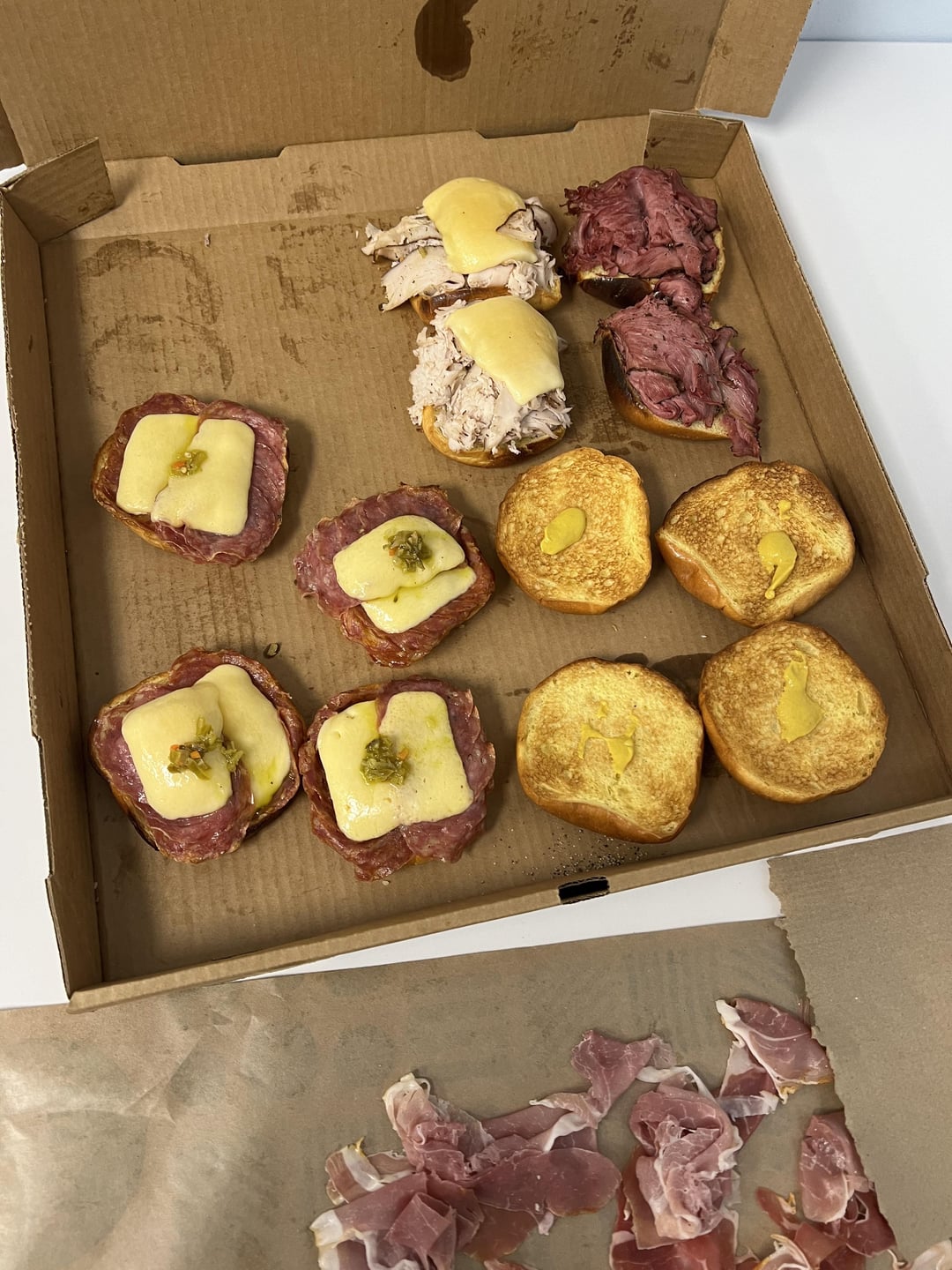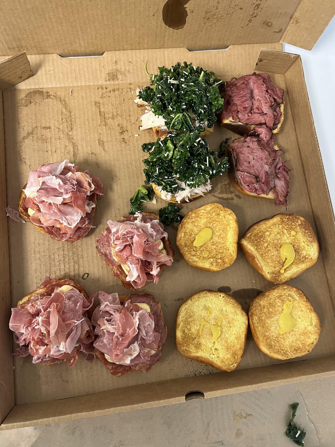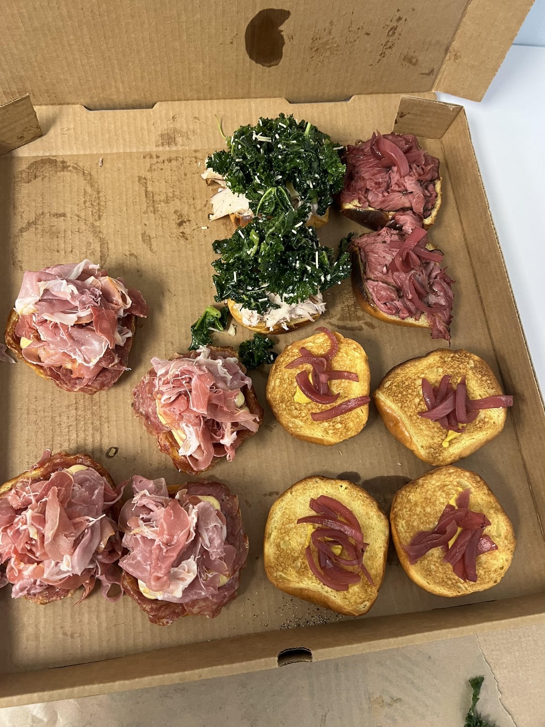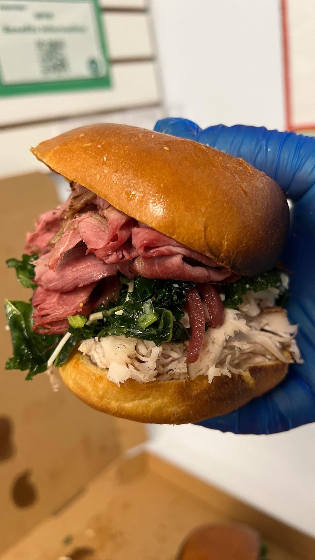 And a pastrami and cracked pepper turkey sandwich with butterkase heated in the pizza oven with sir Kensington mayo, pepper, pickled onions, and garlicky kale