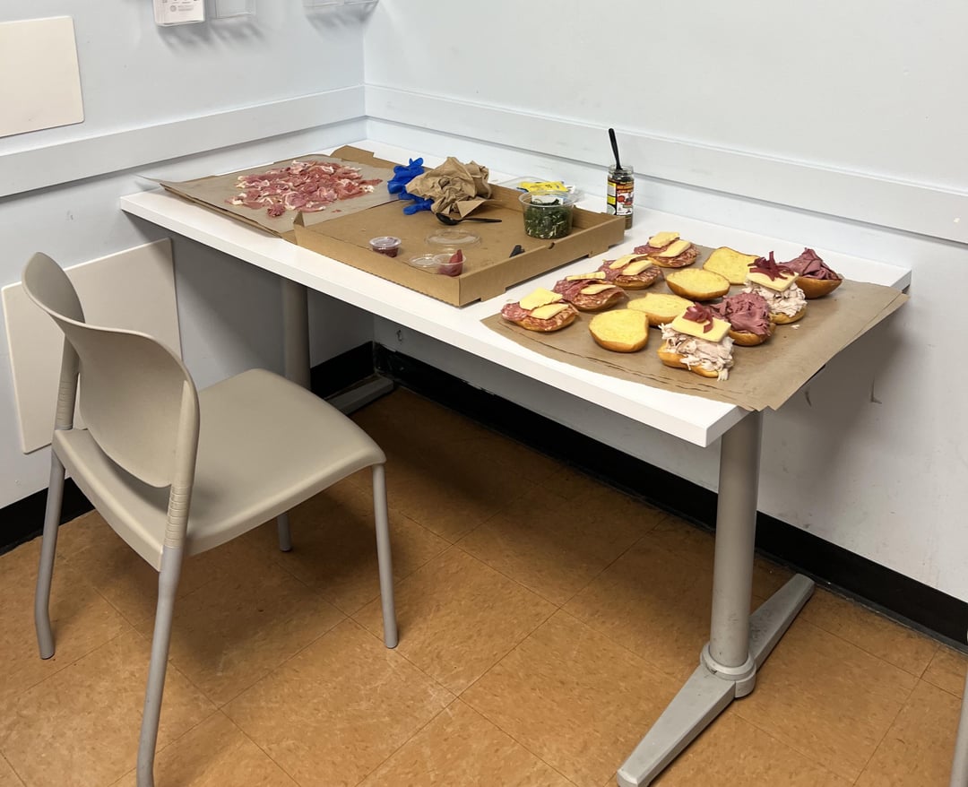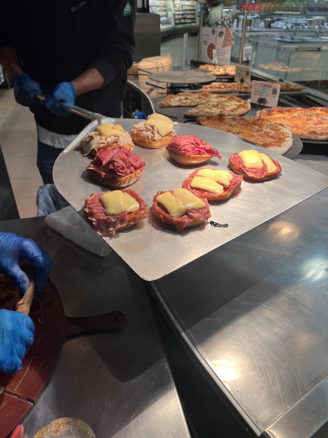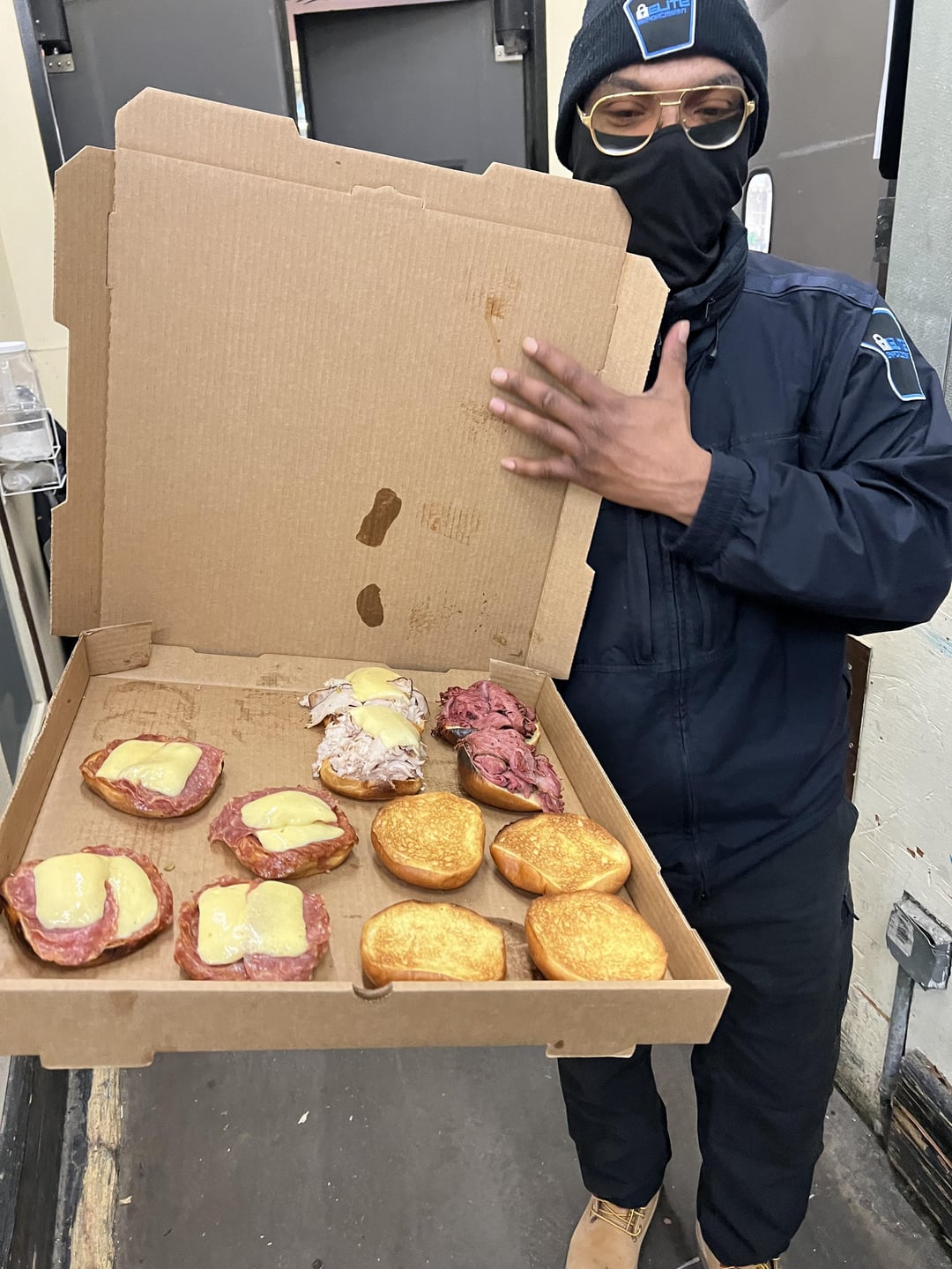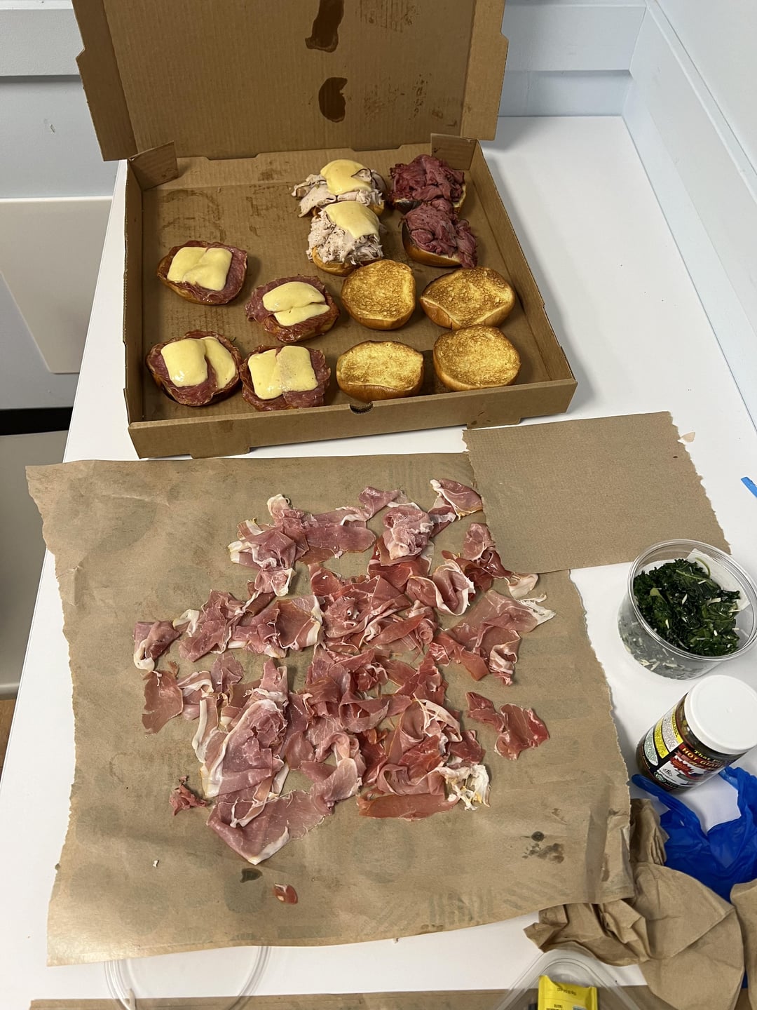 And a pastrami and cracked pepper turkey sandwich with butterkase heated in the pizza oven with sir Kensington mayo, pepper, pickled onions, and garlicky kale