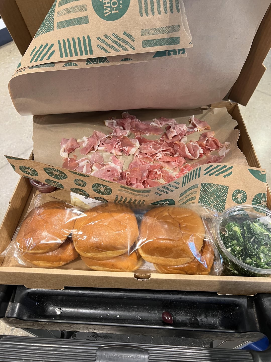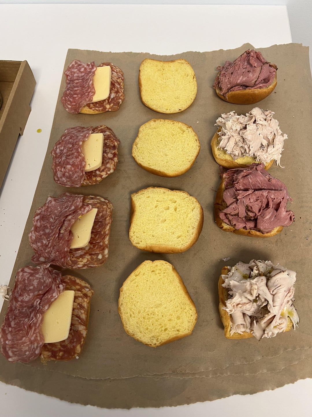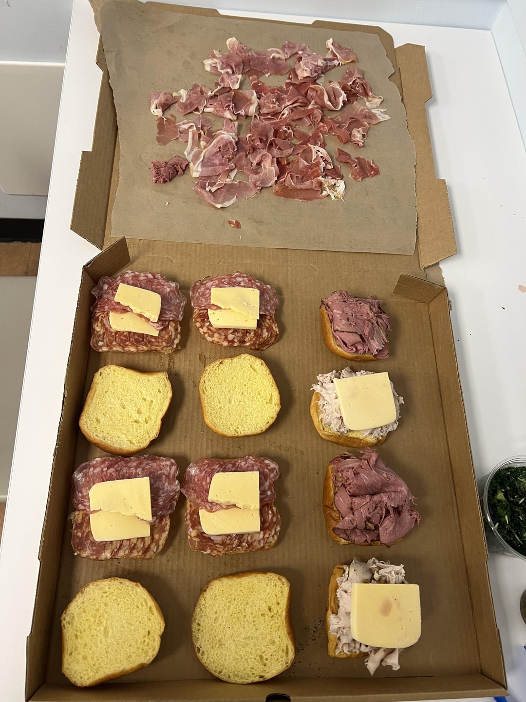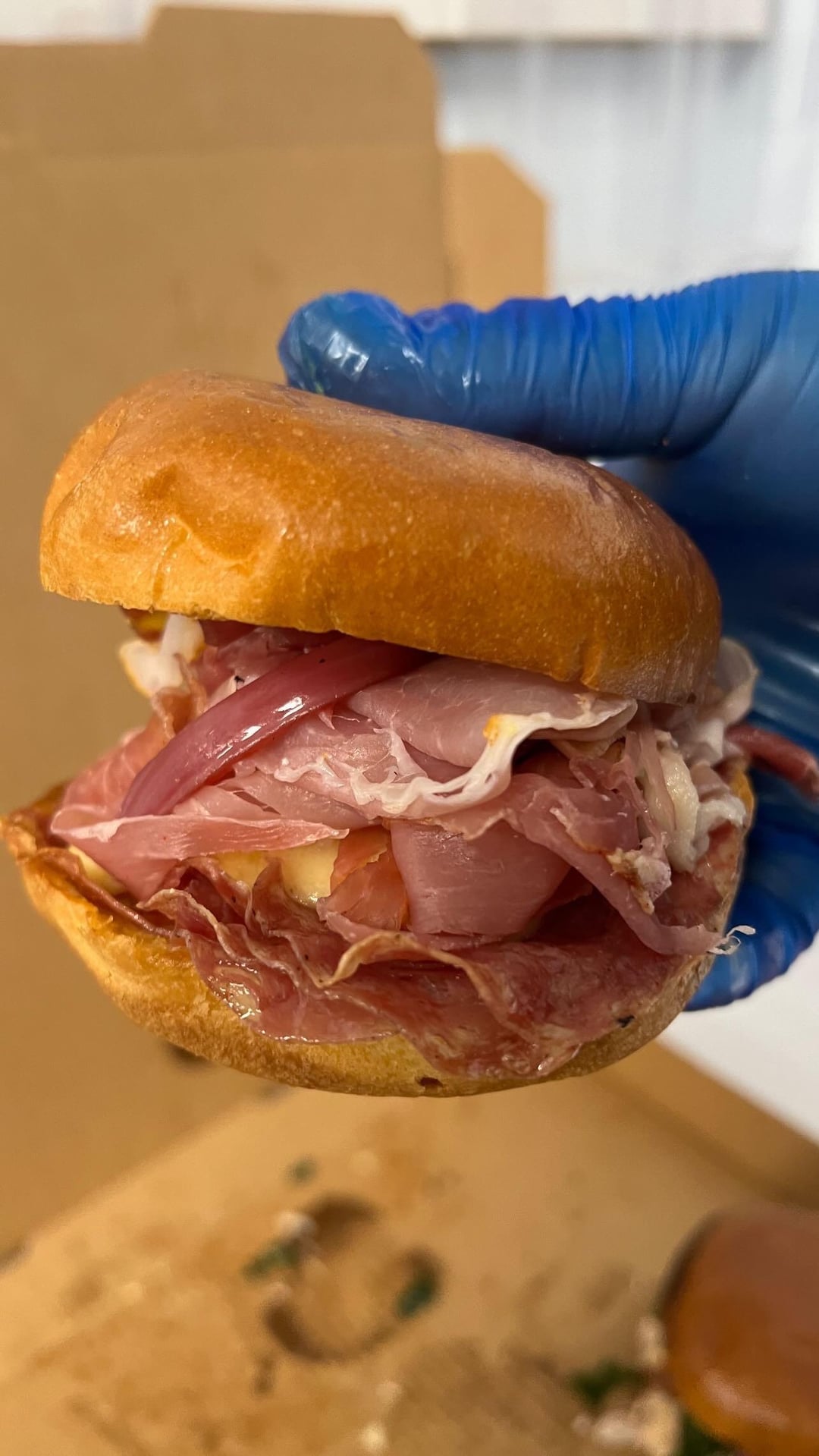 2x Jamon Serrano, varzi salami, and calabrese sandwich with butterkase cheese on a brioche bun with pepper, hot Giardiniera (fresh and toasted in the oven) and garnished with mustard and pickled onions