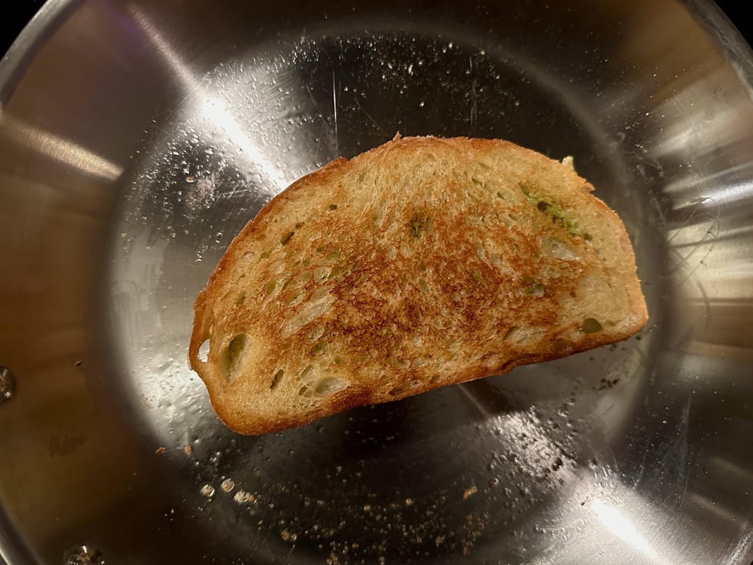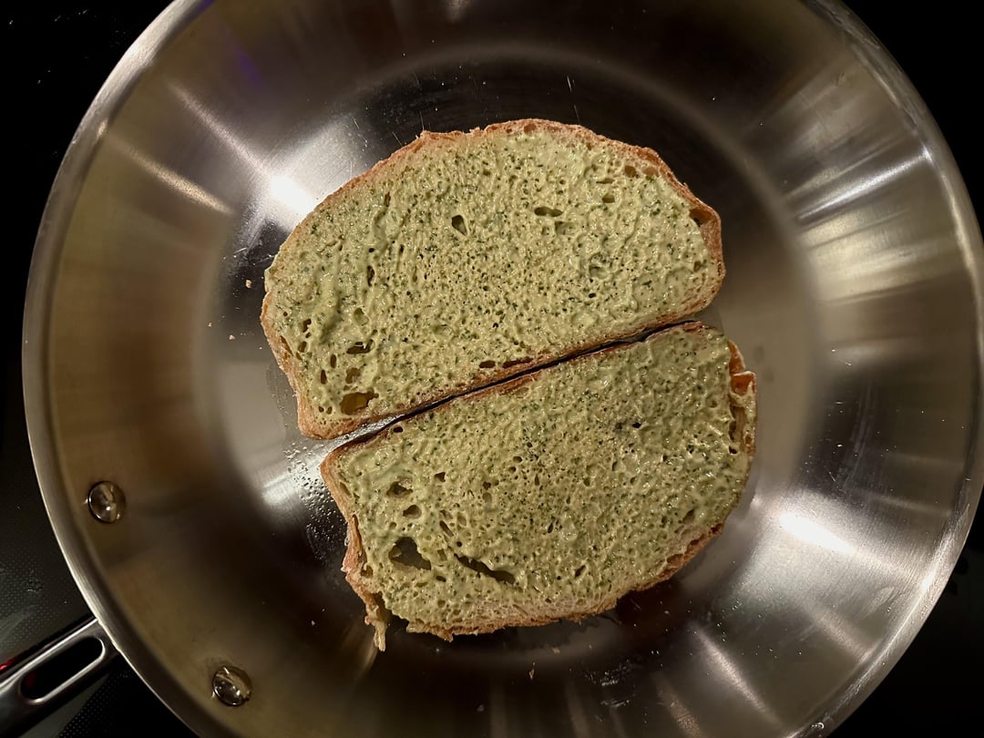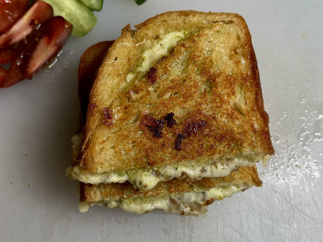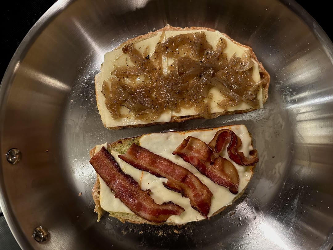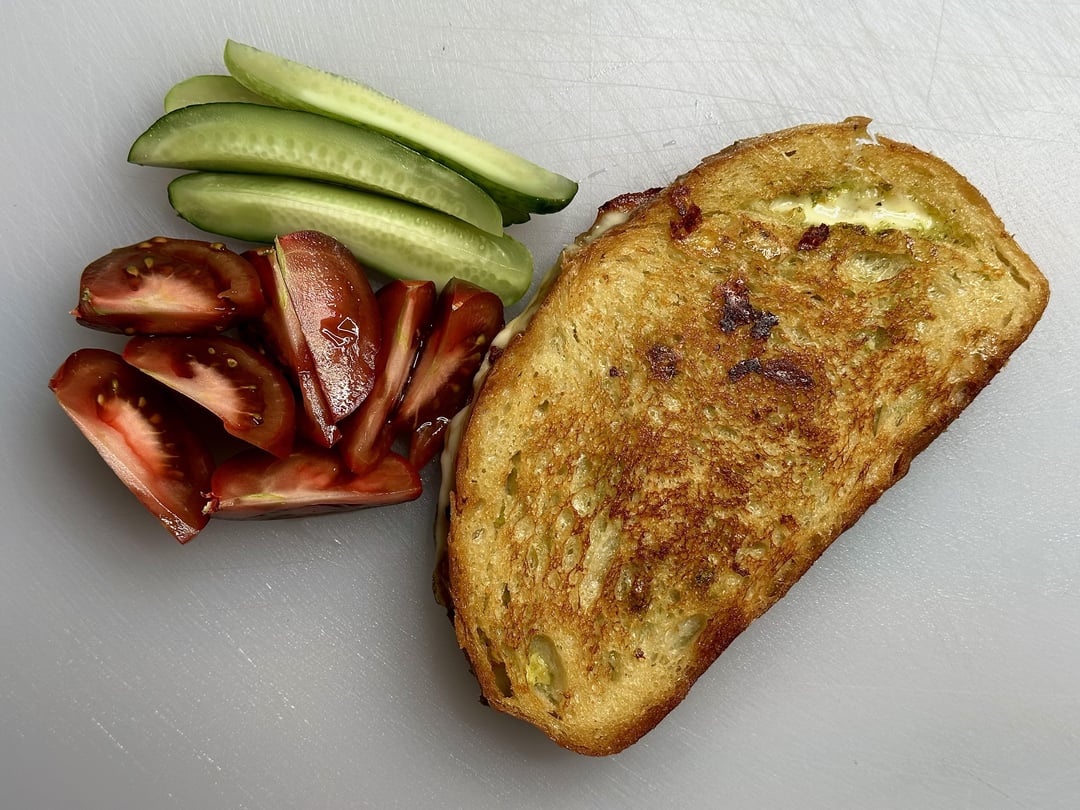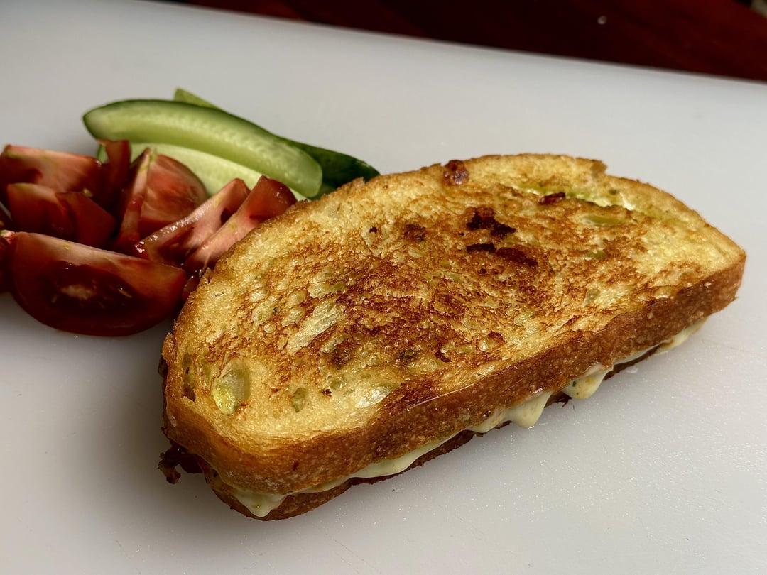 French bread with lots of Kerrygold butter, inside spread with a homemade basil pesto aioli, Havarti, Muenster, bacon, and caramelized onions. Served with tomatoes, and half sour pickles.by No_Pattern3088 Write A CommentYou must be logged in to post a comment.