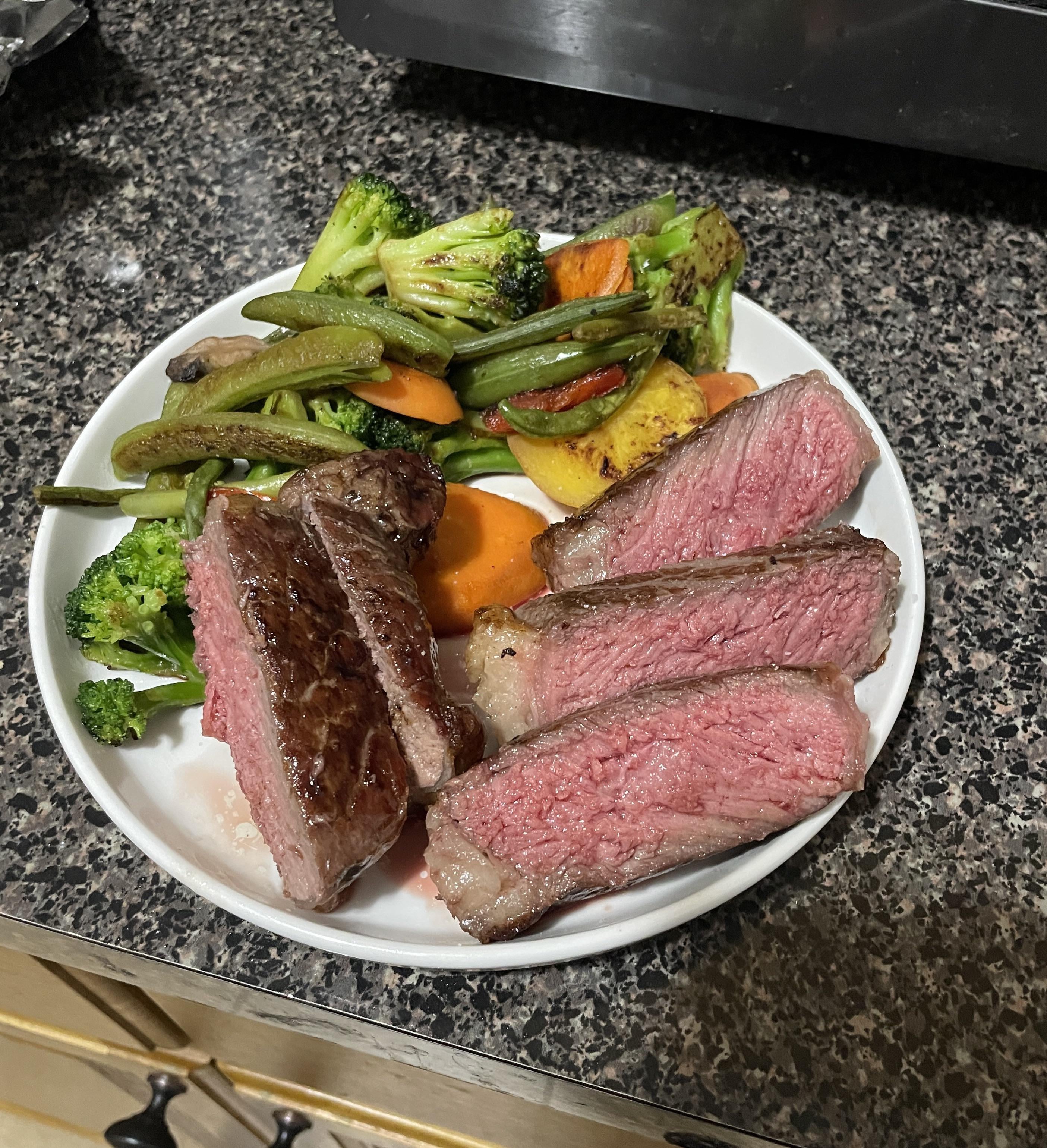 just reverse seared a rib eye (saved half for tomorrow) and air fried some frozen stir fry from costco. Picked up frozen fish and chicken breast to mix it up through out the week.