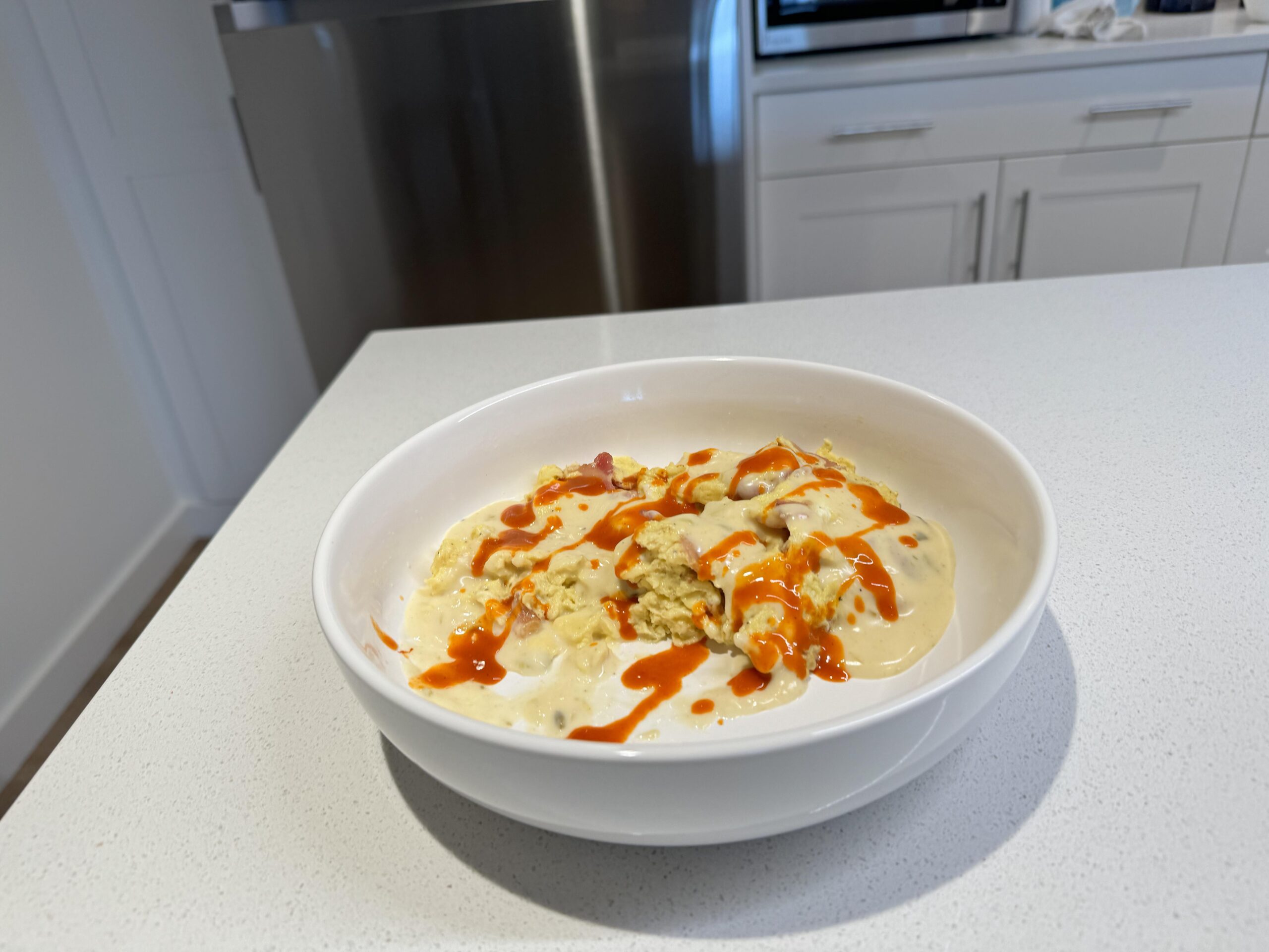 Breakfast today was four eggs, with a splash of heavy cream, whisked, then gently scrambled, with 4 strips of bacon, and heated queso poured over the top, finished with Cholula hot sauce over the top.