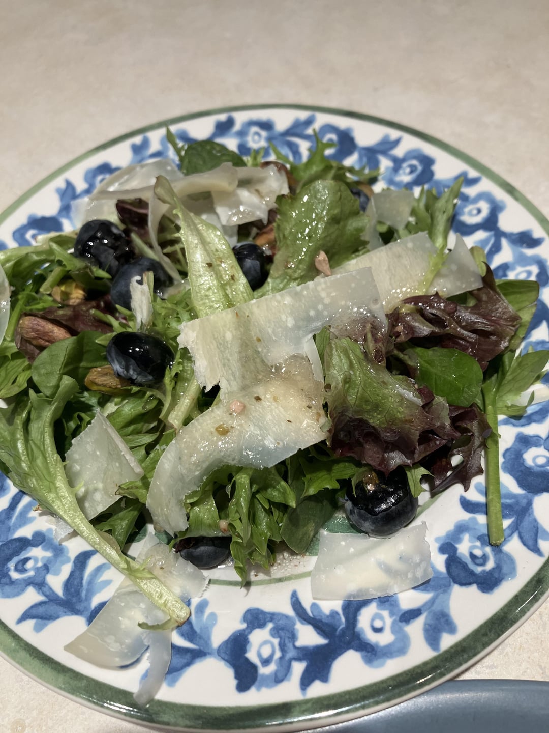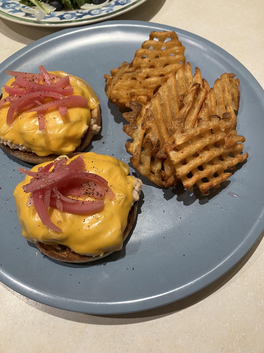 Tuna melt on English muffin with American and pickled onions, and side salad with pistachios, blueberries and Parmesan by Experimentallyintoit Write A CommentYou must be logged in to post a comment.