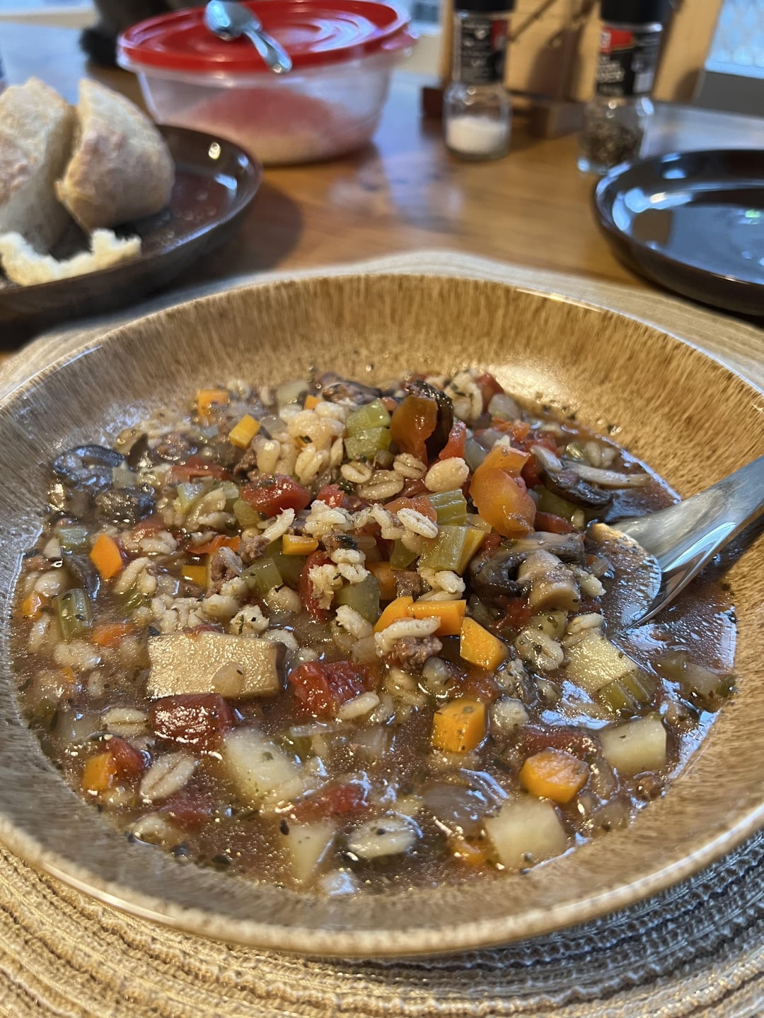 hypno_tode 2 years ago Vegetable, beef, and barley soup:16 oz hamburger or stew beef14.5 oz can petite diced tomatoes1 packet Knorr French Onion recipe mix/soup1 tsp Italian seasoning8 cups beef broth (I use Better Than Bouillion)4 cups water – omit for thicker, more stew-like1/2 cup red wine, optional1 cup onion (I used white)8 oz mushrooms, sliced and lightly chopped3-4 ribs celery, diced4 med carrots, diced1 potato, Russet, diced1/2 cup frozen green beans, optional1 cup barley (pearl barley, quick ok)Few sprigs of thyme, if desired, or 1/2 tsp driedSalt and pepper, to tastePreparation:Brown hamburger or stew beef in skillet. Drain fat, if any. Add to slow cooker. Add remaining ingredients. Cook on high 4 hours or low 6-7 hours.