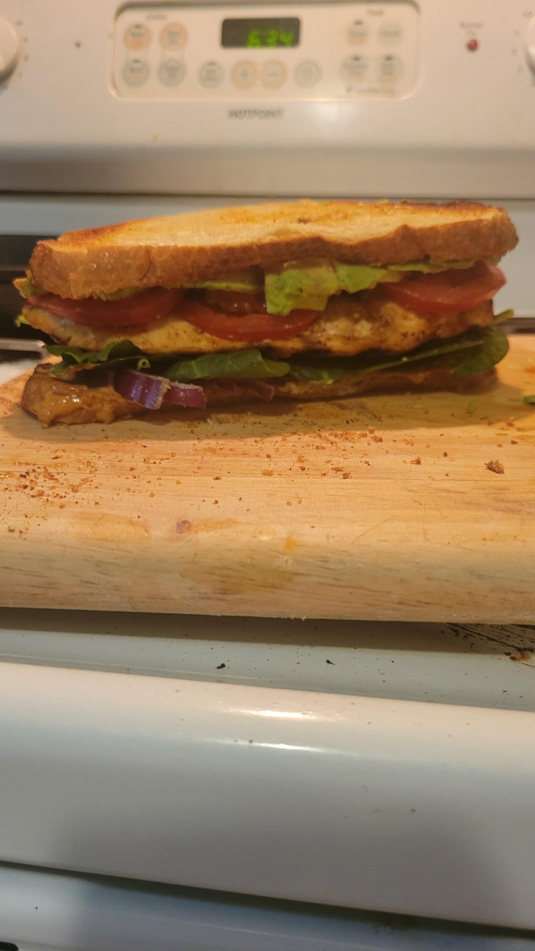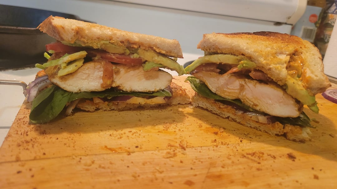 Grilled chicken marinated in orange lemon lime juices with minced garlic, fresh cilantro, cumin, paprika, cayenne, pepper salt Sandwich made with homemade chipotle mayo, tomato, avocado, red onion, spinach