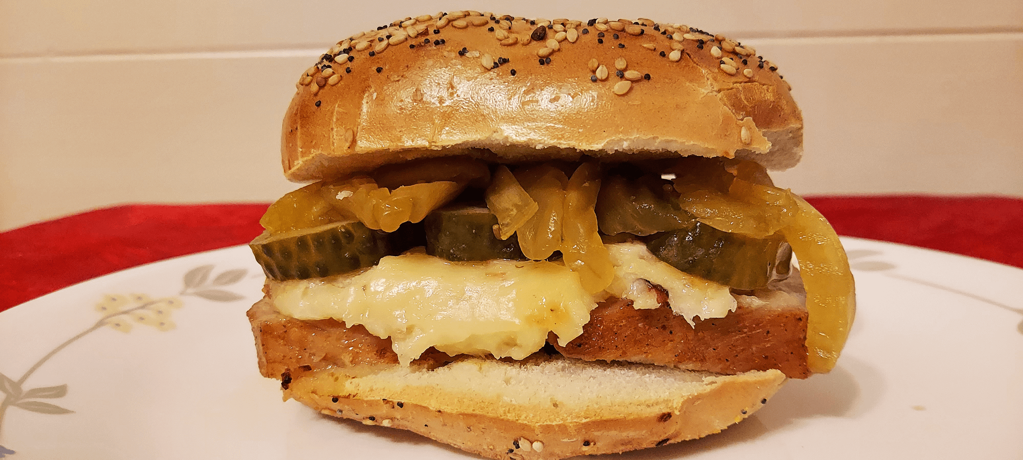Honey BBQ pork loin, baked Bacon & Horseradish Cheddar cheese, SuckerPunch Spicy Garlic Pickles and Pickled Vidalia Onions all on a toasted everything bagel.by toneman238 Write A CommentYou must be logged in to post a comment.