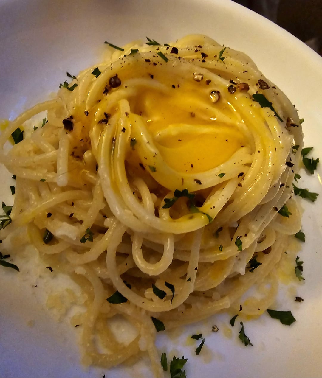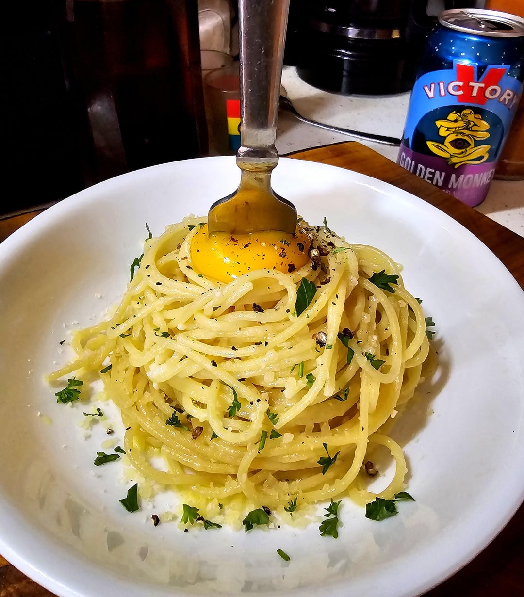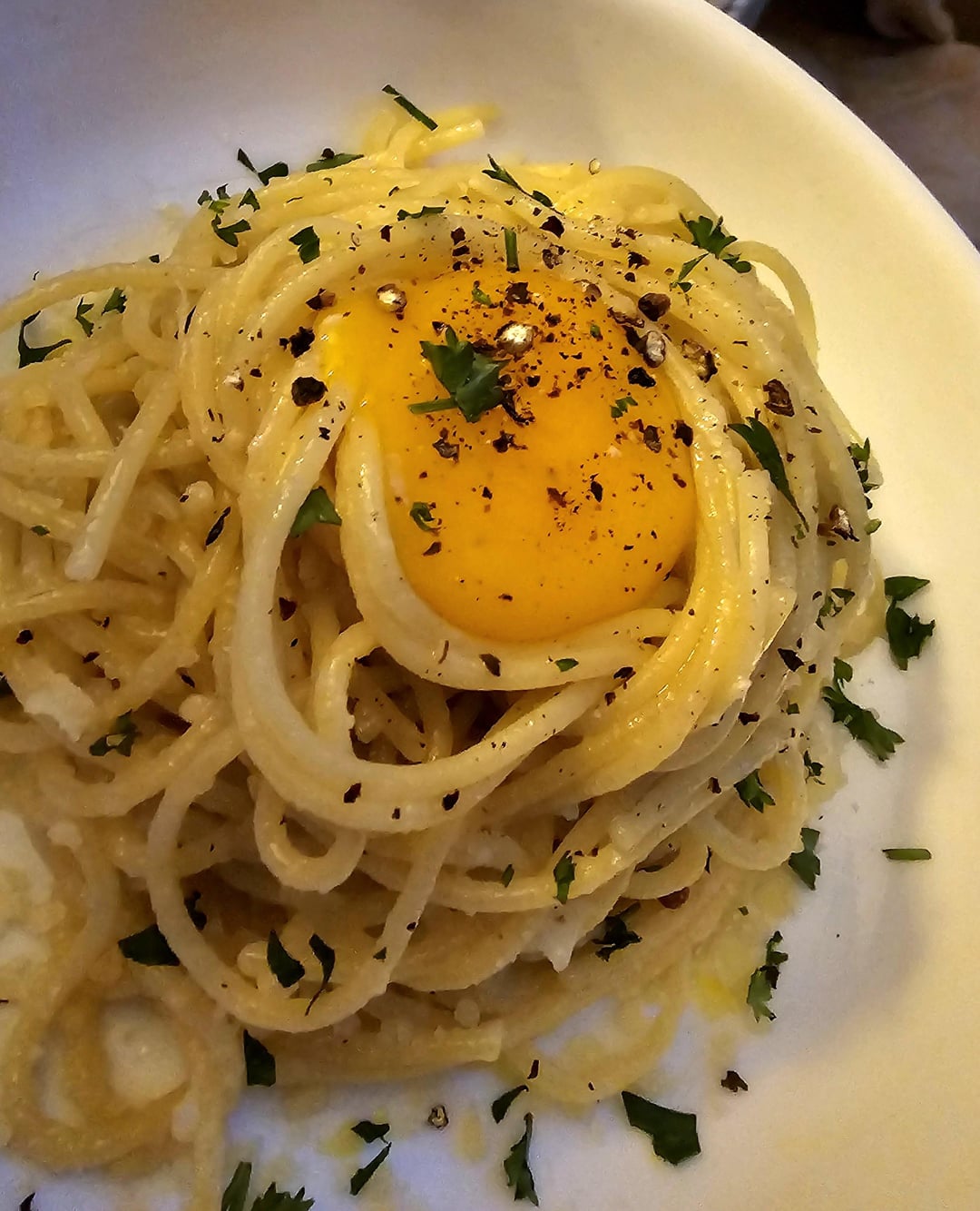 Cook noodles, while they cook separate an egg yolk and set it aside, drain noodles, add butter and let it melt, toss in garlic, parm, basil, oregano, and onion flakes, top w/ yolk, sprinkle of cracked pepper, parm, and parsley