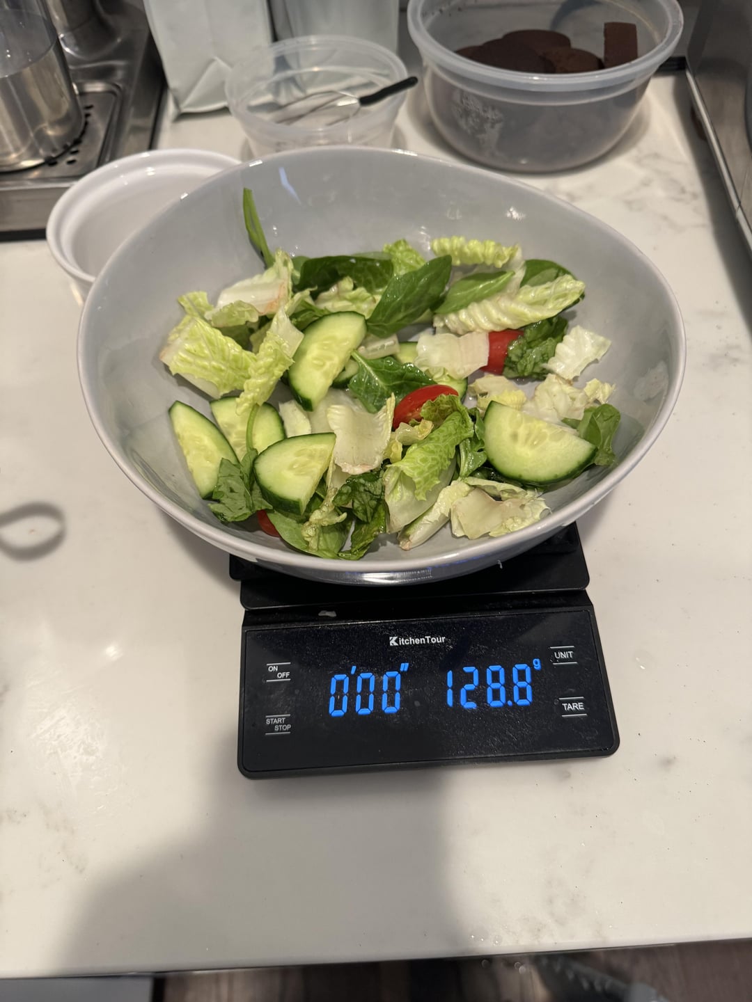 128.8g of romaine lettuce, spinach, tomatoes, and cucumbers