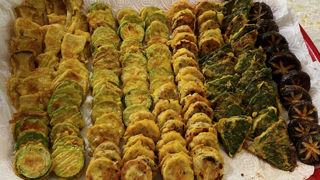 These are shrimp jeon, Dongtaejeon, Korean-style meatball, mushroom jeon, zucchini jeon, perilla leaf jeon and various kinds of jeon.