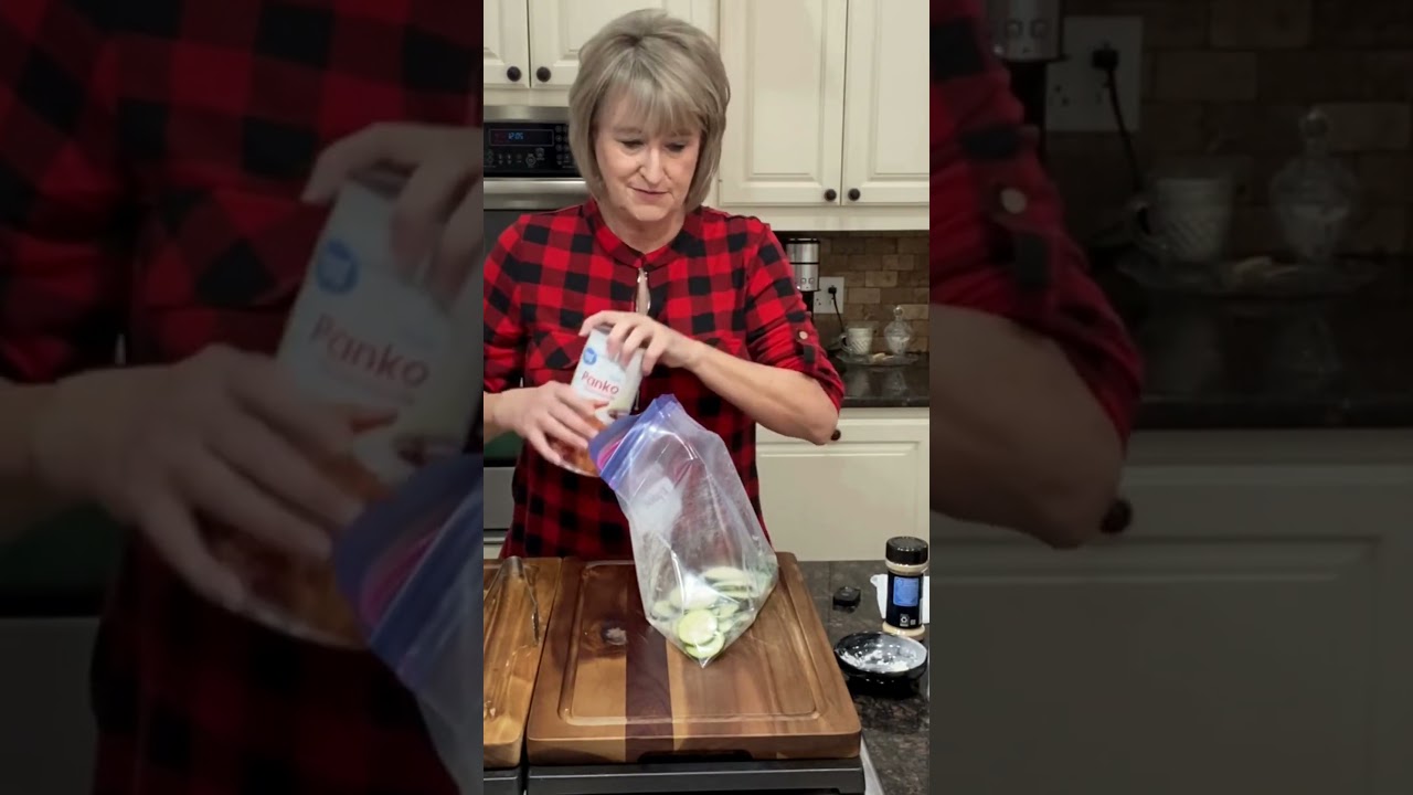 What I’ve done is chopped up some zucchini and I’ve got a little olive oil and I am going to throw in a little flour going to put that in my bag like this some Parmesan cheese and I’m going to cat that then I have Panko bread crumbs I’m just going to sprinkle that