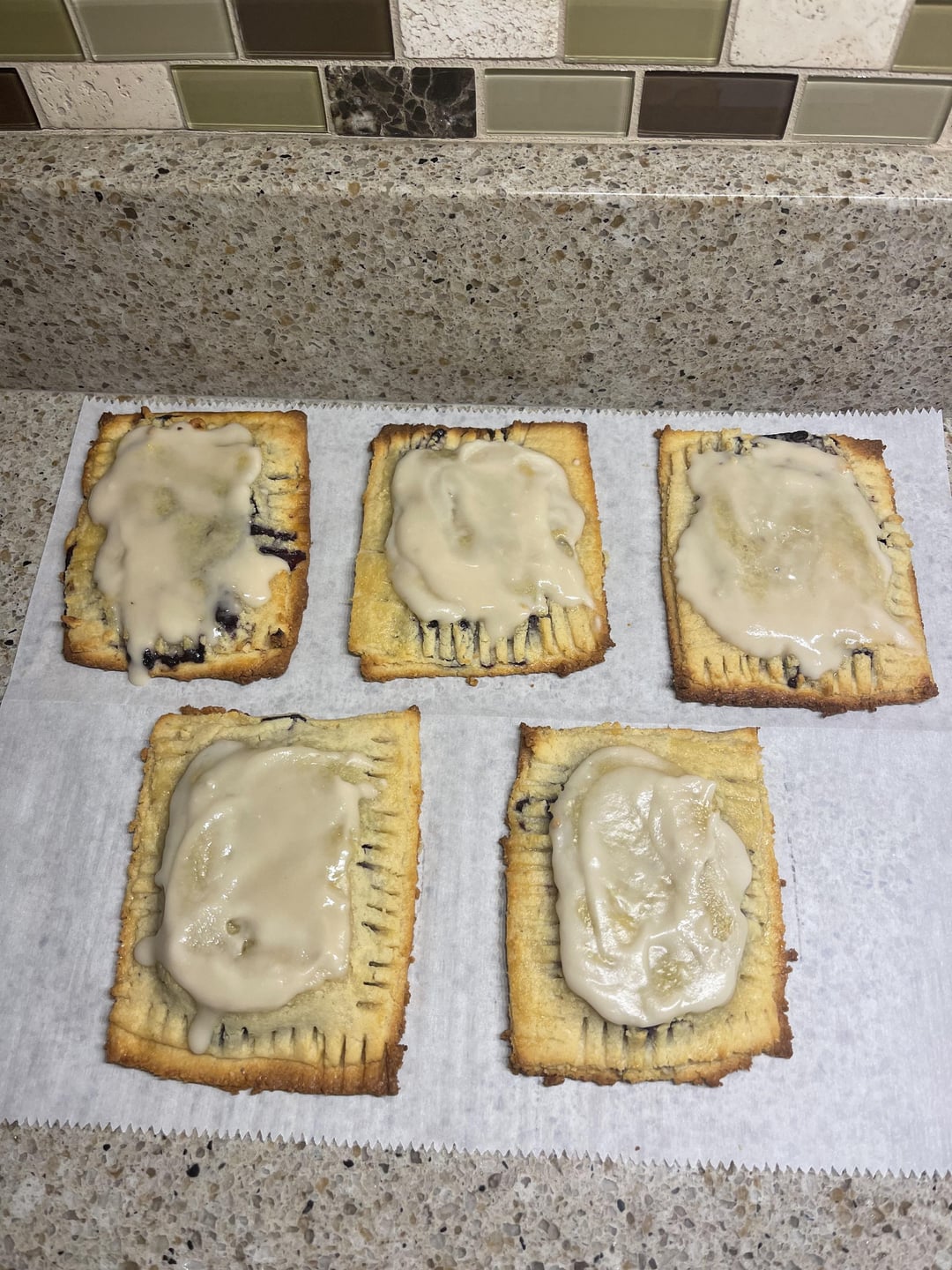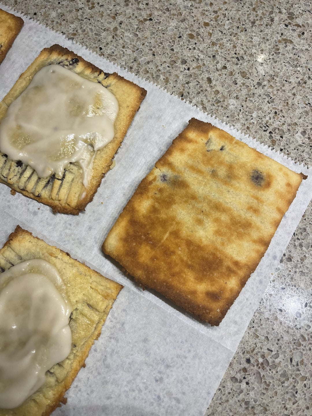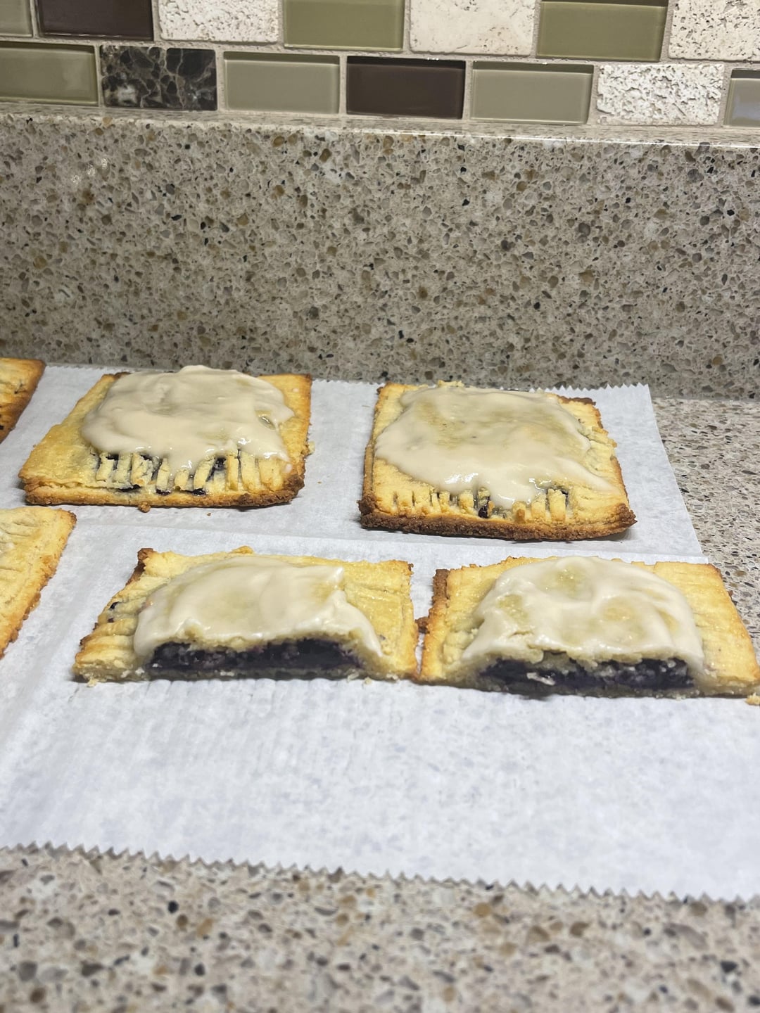 13.Mix the icing in a bowl with a teaspoon until smooth. Add the water a few drops at a time until to your desired thickness, approximately 1 tbsp. Ice the pop tarts using the back of a spoon and allow to cool to set. Option to sprinkle with freeze dried raspberry powder or sugar free sprinkles.