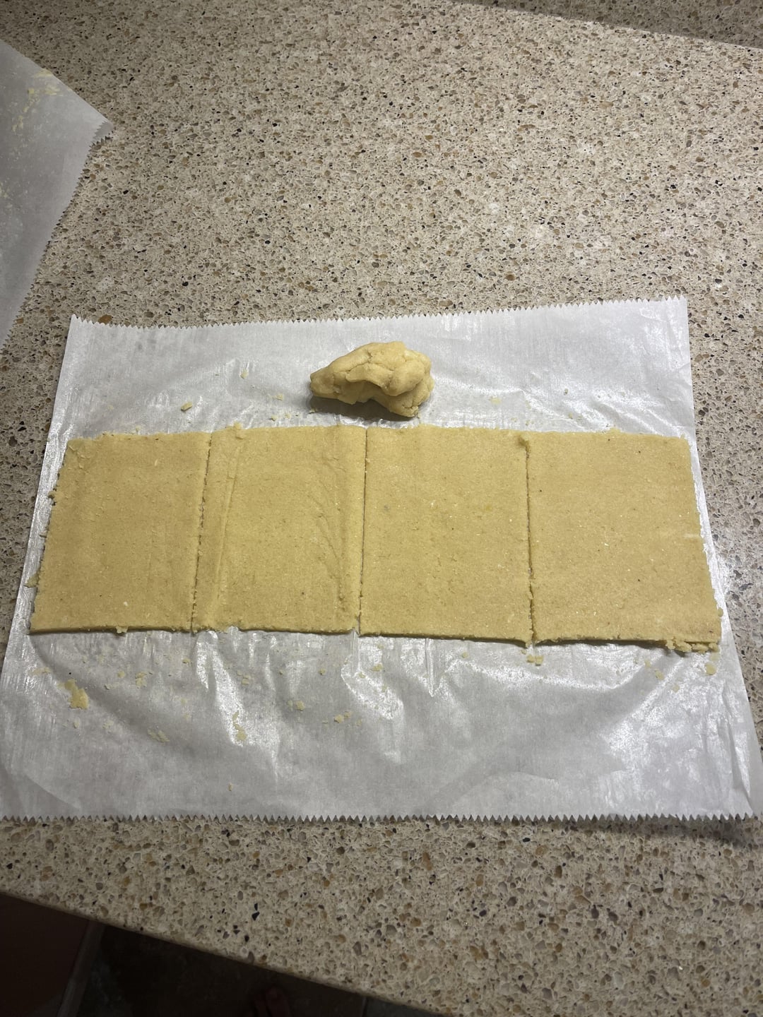 7.Cut the edges off and cut into 4 rectangles. Repeat with the remaining ball. Use any leftovers to form the last two rectangles. Depending on how thin you roll it you should get 10 rectangles.